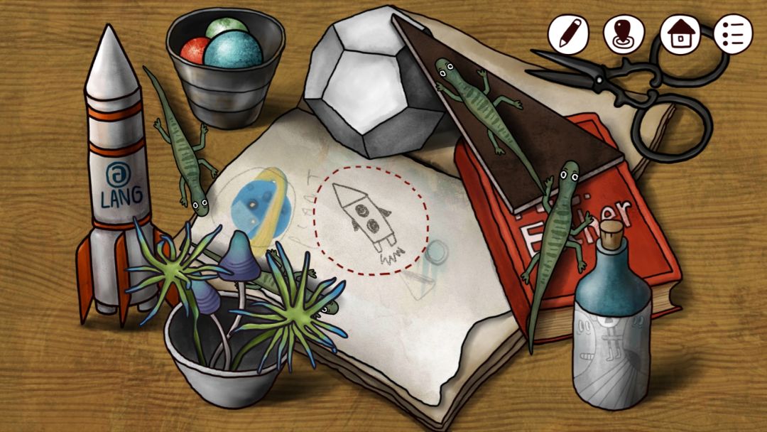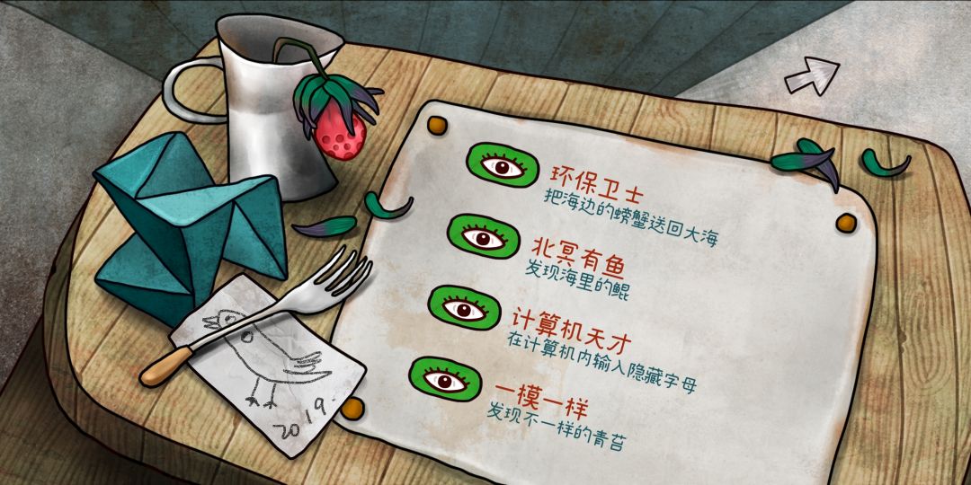 「通关打卡」 剪下火箭,开始。往下,棕外套想要火。往下,涂鸦沙滩海水第三次冲出号角涂鸦下有块石头。往右,红鸟沙滩海螺崖上能采果实。往右,路牌下捡到木棍。山洞,遇到灰毛衣给他号角,水池上震出一个洞,往里捡到开关调节器石头穿过窟窿顶出一颗种子,种子泡进水池拿到正方形块,方块放进窟窿洞穴打开暗门,调节器关闭油灯观察壁画记下符号。涂鸦沙滩往左路过藤蔓门,壁画图案Θ一屮×激活崖边指路灯。红鸟沙滩停靠一艘船,赶红鸟上船让白帽子喂鸟果实,船舱蓝帽子想要金块,地下室捡到长方块用案板纸条圈叉圈叉圈叉叉打开箱子拿到打火石。给棕外套送打火石拿到金币,木棍点燃成火把。去藤蔓门烧掉藤蔓进入,门左墙壁拿到铲子,132进出门出现第四道门,拿走灯管用门右墙壁图案开小门,石雕星球调整高度在海螺崖最高处2143拿到金块。给船上蓝帽子送金块拿到一块肉,甲板投币给望远镜调整后记下看到的四个符号代表物体,灯管送给水手服后从旁边下去找到反光镜。回藤蔓门肉块喂狗拿到骨头,进红门安上反光镜调整折射到大门眼睛开大门见到章鱼,骨头接断触拿到不规则圆球,用涂鸦沙滩涂鸦打开的墙壁提示用火烤球,找棕外套烤球后拿到圆球。壁画洞穴挖出圆锥,走时拿走正方形块,记下路牌符号位置后上到海螺崖顶放好圆锥圆球方块长块,在船上找到密码24'34'24'24打开飞船,白绿紫红门开回到儿时。二楼桌子拿到书,墙画③减②除①是11:18,小三角屋拿到空瓶子,放映室移开摆件拿到面包,灯泡通电打开暗室给瓶子装水。二楼用面包拿到蚂蚁,一楼罐子加水拿到撬棍调整闹钟拿到电池。二楼书柜按数字放书数量进卧室,机器人面罩有四个颜色,上阁楼撬开墙拿到拼图,给机器人安电池看表情笑平笑哭哭笑平。暗室1312213打开柜子拿交卷,蓝黄绿红洗好交卷后去放映得到Shell用来打开卧室电脑,电脑陀螺图案手眼水鸟用来打开三角屋柜中盒子拿按钮,按钮装在电脑屋机器人头上拿到铅笔。回飞船,盒子放好物品见到章鱼,童年三角屋桌子红1蓝3黄4白摆放球,火箭发射,开始新游戏。 拿石头记涂鸦,海冲上口琴,捡木棍,给灰毛衣口琴,拿种子开关调节器,拿果实,小鸟旁蓝色种子,修好信号器召唤船,给船长蓝种子喂鸟,船舱拿长方块给黑裙子果实换火机,给棕外套送火机拿金币搞火把,烧藤蔓拿铲子召门四,记门4小门密码,拿灯管,拿金块,换肉块,送灯管拿反光镜,投币记符号,喂狗拿骨头,调反光见章鱼安骨头拿圆块,烤火圆球挖出圆柱拿走方块,召唤飞船,24'34'24'14进飞船,每个颜色点一下最后纯色回到童时。二楼书、空瓶子,放映室面包,暗室接水。面包换蚂蚁,一楼盆栽浇水成熟拿撬棍,放书进卧室阁楼翘墙拿拼图,床头平笑哭平笑拿到暗室胶卷,shell开电脑,眼鸟水手开海鸥盒子拿纽扣给机器人,飞船放物品见章鱼,撬开章鱼头,让飞船飞一会。