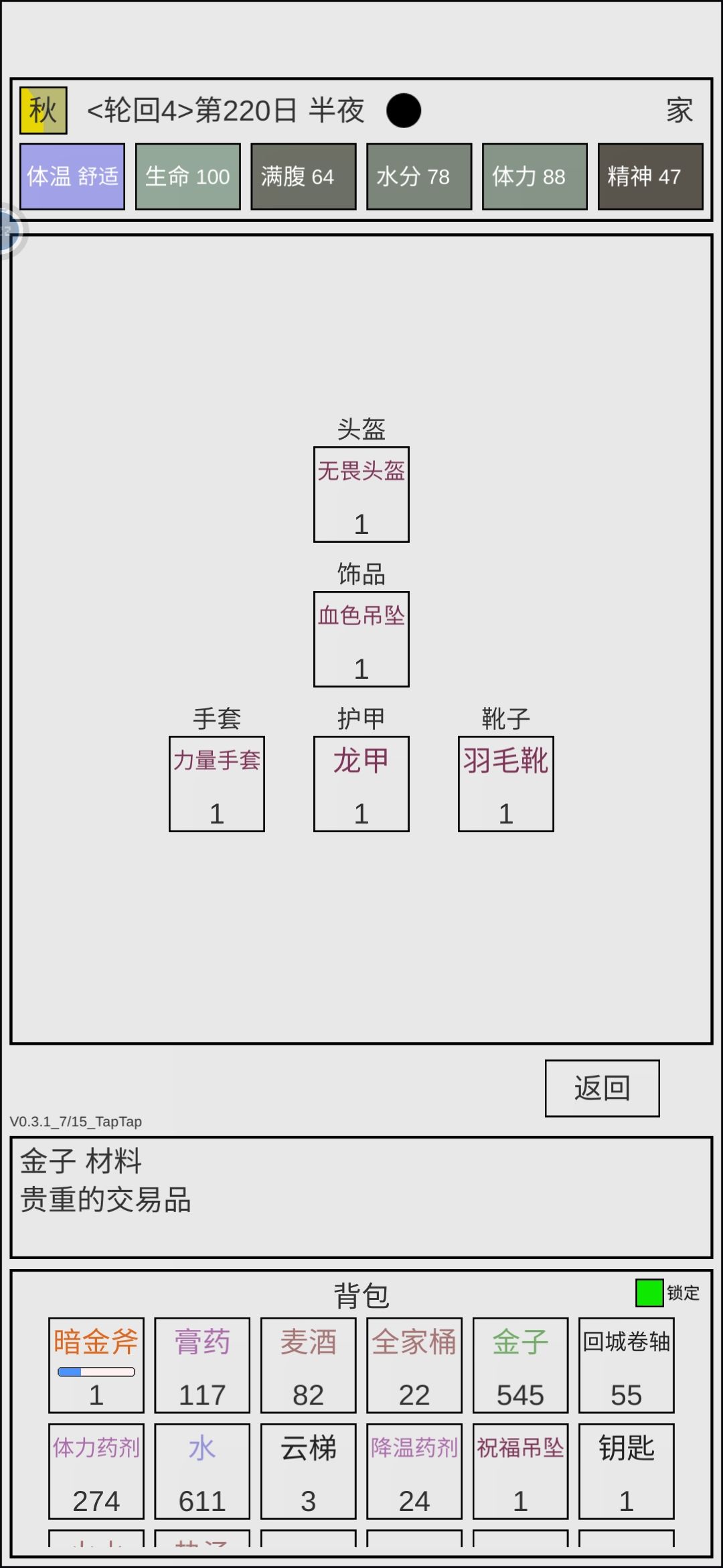 lz因为总是被蝙蝠打死,所以开局选了精锐狙击枪(82),然后技能优先买防御,等到能打穿潮汐塔,可以用云梯直上40层来回多打几次boss(40层有个很弱的怪一个300金。)备注:这时候还可以去做完地下通道任务,掠夺村民有500g!