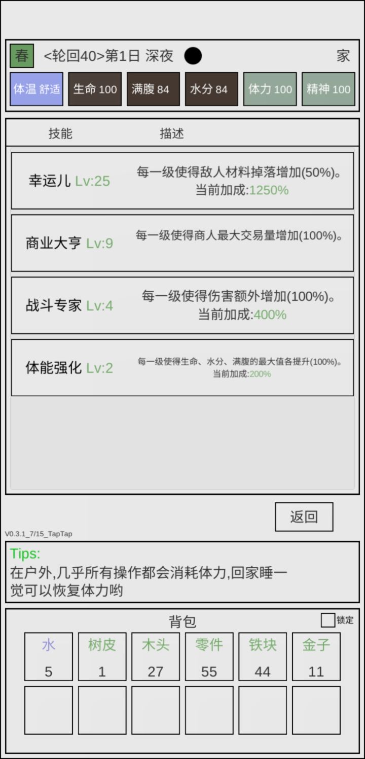 lz因为总是被蝙蝠打死,所以开局选了精锐狙击枪(82),然后技能优先买防御,等到能打穿潮汐塔,可以用云梯直上40层来回多打几次boss(40层有个很弱的怪一个300金。)备注:这时候还可以去做完地下通道任务,掠夺村民有500g!