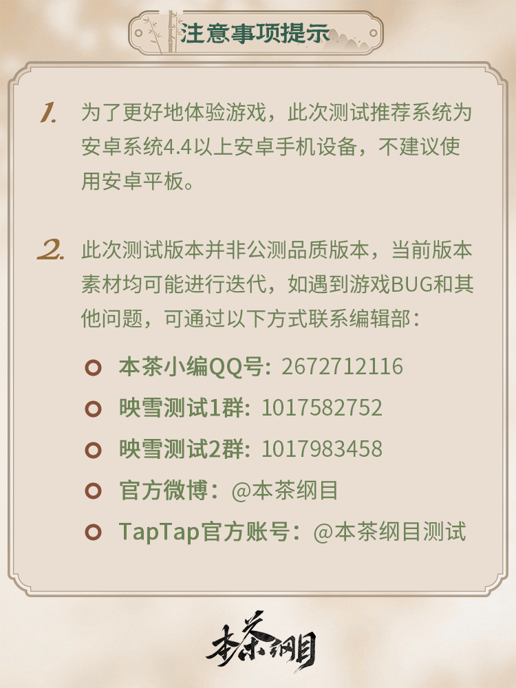 『勤耕不辍收春露,映雪烹香候友朋』编辑部整理了让著灵者事半功倍的【领码&测试包下载】秘卷,为著灵者的影川访茶之旅保驾护航!《本茶纲目》映雪测试的调查问卷抽选活动已于今日17:00停止。※本套流程仅适用于在TAPTAP平台获取测试资格&下载安装包。>>>『一心一念动,著契挽山河』国风二次元茶拟人游戏《本茶纲目》预约正式开启!官方网站:https://www.benchagangmu.co