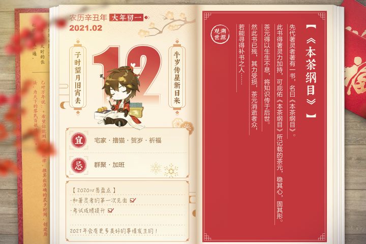 辛丑牛年,正月初一,宜开新年历~大红袍已经抢先写上了第一页,不愧是你——天下第一!……怎么都是去年的盘点,新年的愿望呢?“愿望啊,那是我要放在心里,努力实现的东西!等到实现的那天,再说出来也不迟!”