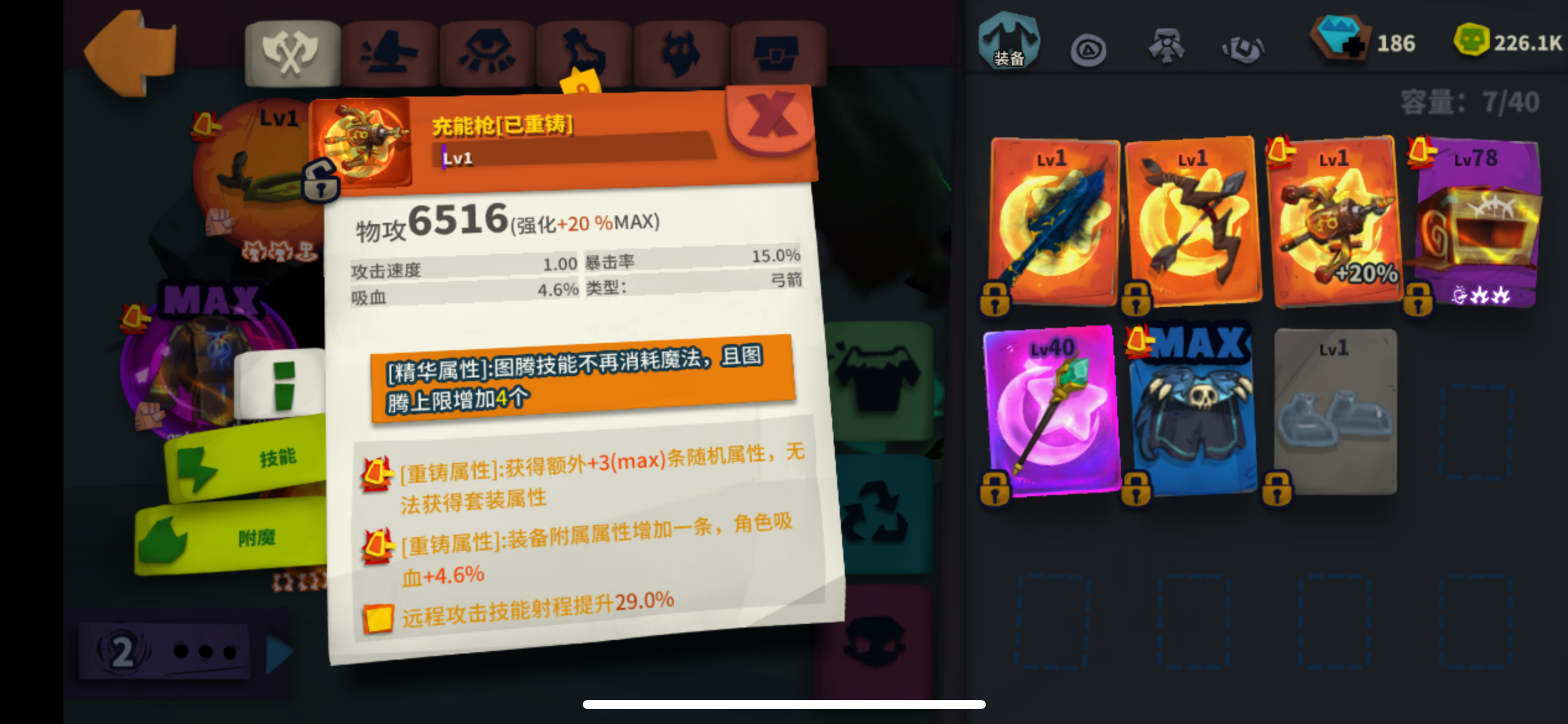 闪电印记还得提升物攻,基础高了伤害才能上来,到T是太难了!斧子配合多波次和召唤物聚合每多一个召唤物增加百分之10的攻击,还能提升点物攻并保持一个变异召唤物在场维持加8球!