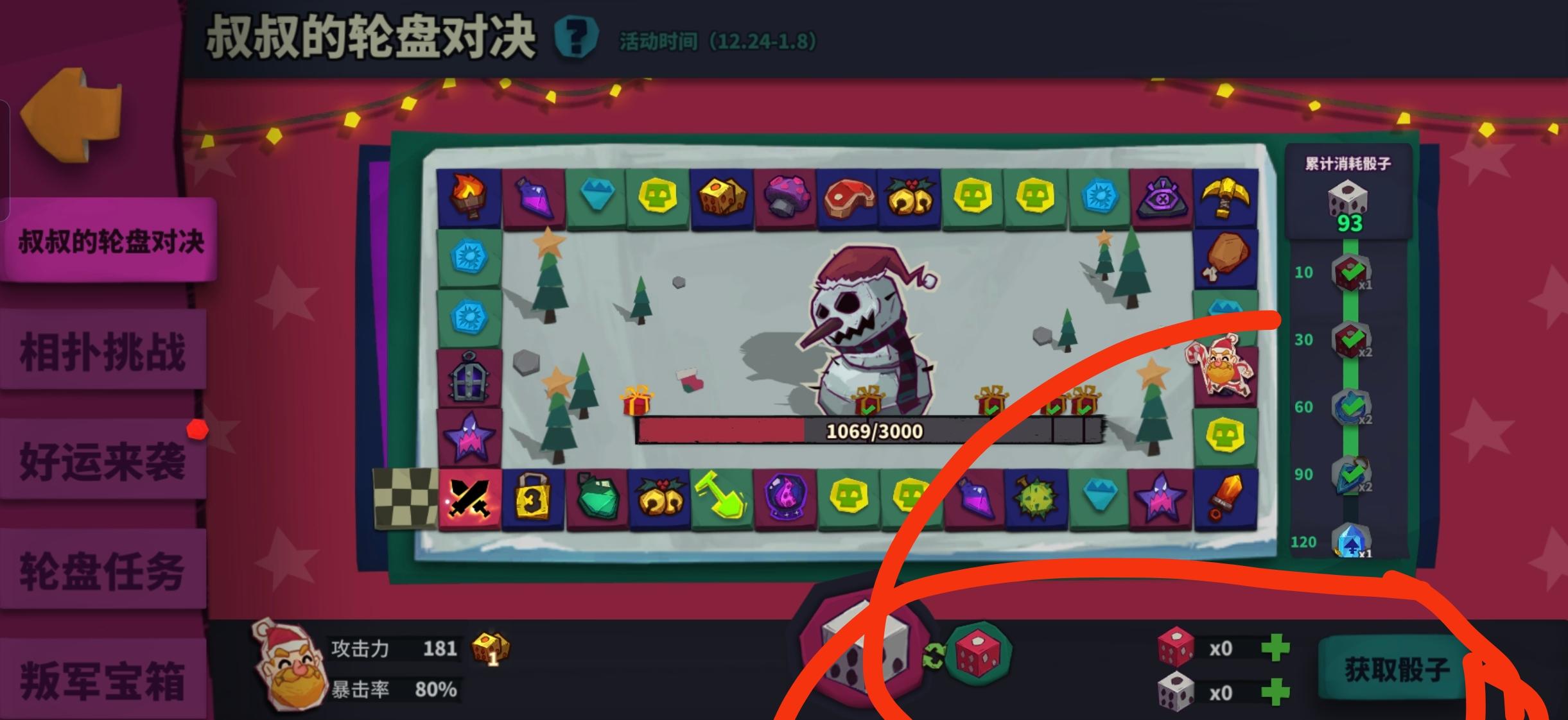叮叮当,叮叮当~圣诞节即将到来!新活动“叔叔的轮盘对决”已就位,快来和叔叔一起挑战雪人Boss吧!▍活动规则在本次活动中,骑士们需要投掷骰子,根据骰子掷出的点数在轮盘上行动。骰子可通过轮盘任务和礼包获得。(礼包中包含有功能更强的遥控骰子)棋盘上分布有不同的格子,不同的格子上会刷新各种基础奖励、增益道具和减益道具,骑士们需要合理规划自己的行动路线~部分增益道具:五回合内,若投掷的点数<3,