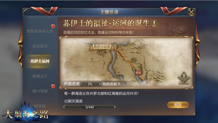 古老的苏伊士运河,是商人们青睐的运输命脉,也是众多海盗出没的是非之地。9月,《大航海之路》正式迎来上线四周年庆典,游戏也将邀请所有船长一起,体验开辟苏伊士运河的史诗级经历,维护海上的正义和秩序,建立一条全新的黄金航线!周年庆期间,游戏还为船长们准备了登陆抽奖等专属福利活动,更多惊喜等你来解锁!开辟苏伊士运河黄金航线周年庆专属活动即将来袭9月,《大航海之路》正式迎来四周年庆典,也邀请所有船长一道