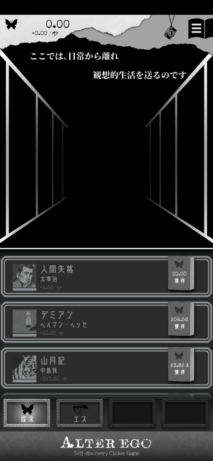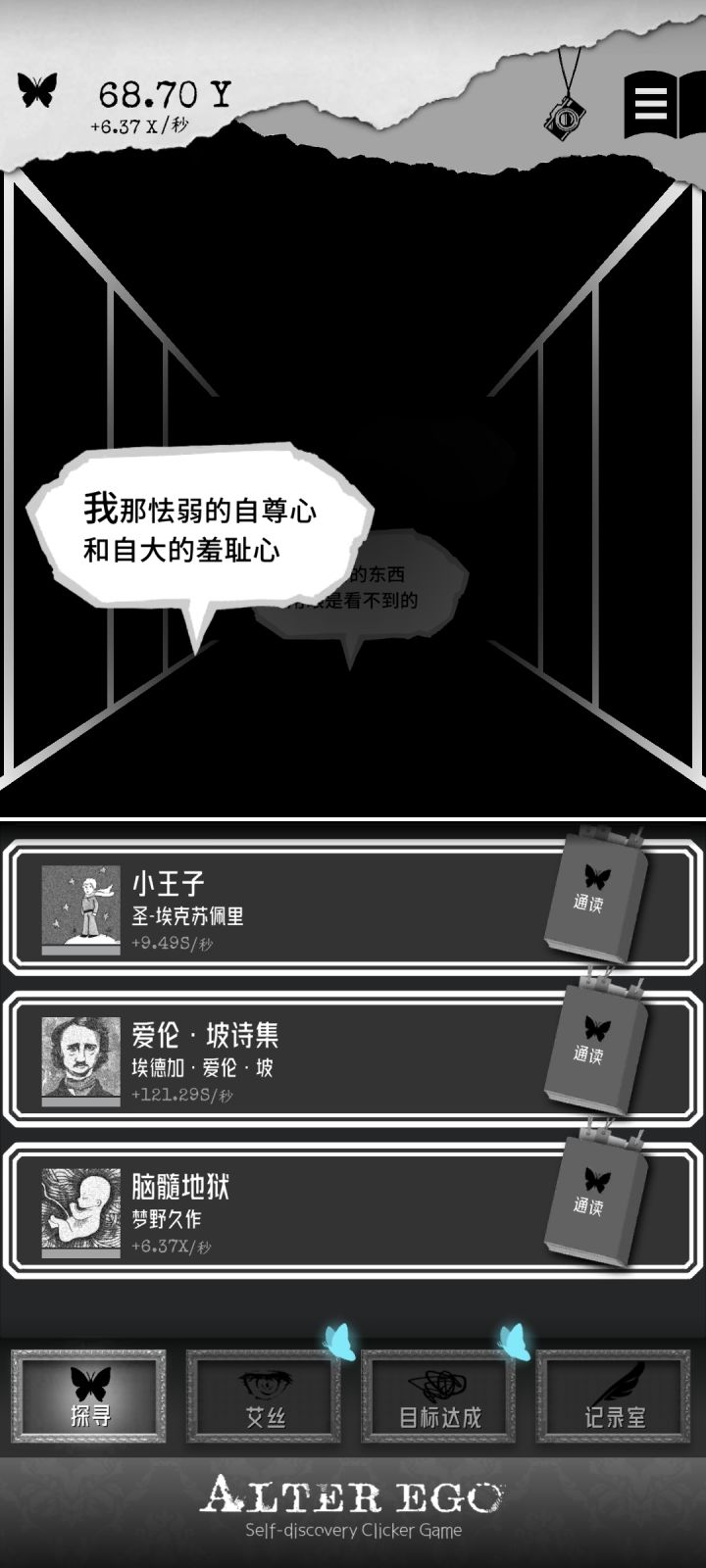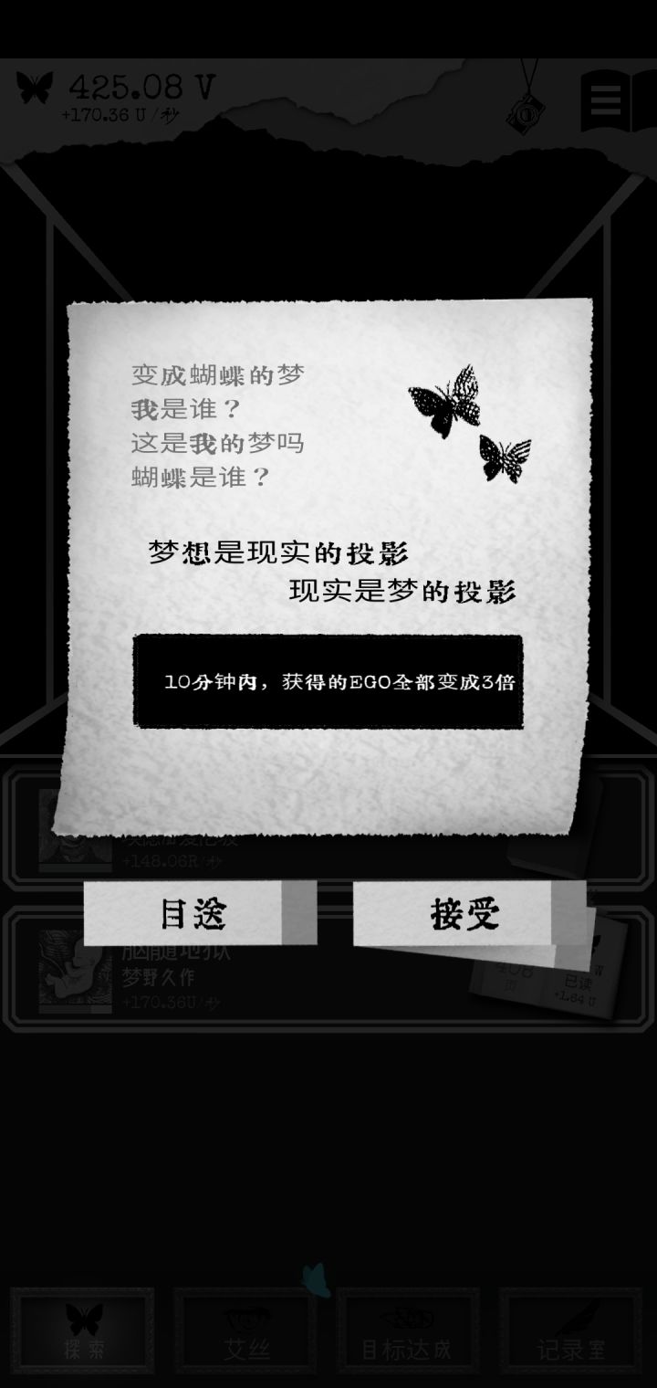 肝完了《脑髓地狱》就算是时间调度大法也估计调了两个半小时。不过中途还发现了一些彩蛋。(当我发现它不止496页的时候我差点疯了,还好后面一百多页不是很难凑。)1.当泡泡凑近的时候点泡泡的ego大概会是原来的两倍。(可能就是要你直面问题吧。)2.到后面(不知道什么时候会有每日一只蝴蝶,触发10分钟内所有获得ego乘三的buff)3.到了后面我才知道,原来Es房间的那只蝴蝶是可以点的😓