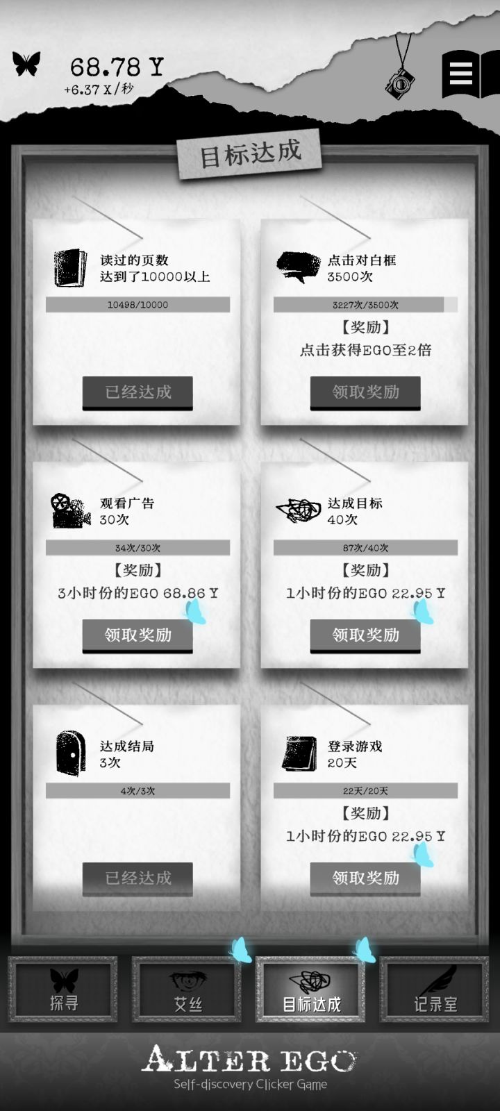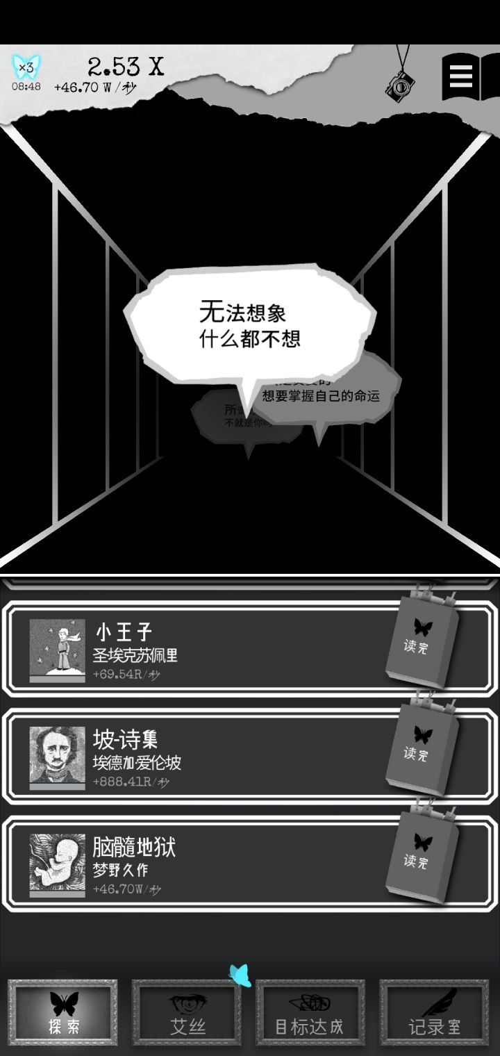 肝完了《脑髓地狱》就算是时间调度大法也估计调了两个半小时。不过中途还发现了一些彩蛋。(当我发现它不止496页的时候我差点疯了,还好后面一百多页不是很难凑。)1.当泡泡凑近的时候点泡泡的ego大概会是原来的两倍。(可能就是要你直面问题吧。)2.到后面(不知道什么时候会有每日一只蝴蝶,触发10分钟内所有获得ego乘三的buff)3.到了后面我才知道,原来Es房间的那只蝴蝶是可以点的😓