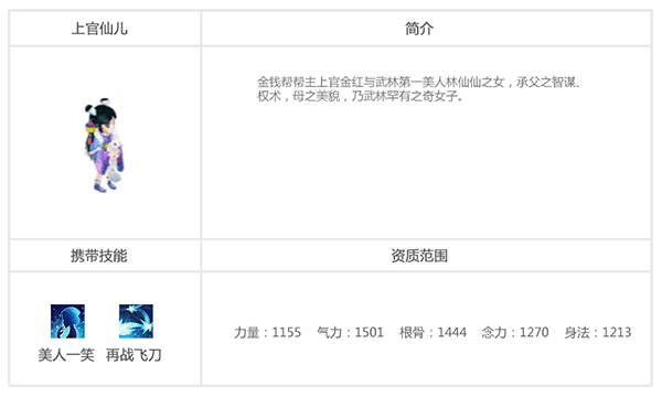 上官仙儿乃武林第一美人林仙仙之女。在《盖世豪侠》中,和林仙仙的群体法术系玩法不同,上官仙儿拥有的溅射伤害也是非常厉害的!35级可出战,必带连招,可携带祝福,涅槃,波动。专属技能《美人一笑》(对目标造成一定的内功伤害,并附加自身等级*0.8的内功伤害)《再战飞刀》(使用美人一笑后造成的伤害将溅射额外2个目标,造成30%的伤害,如果致死则可以再多溅射一个目标)玩法:溅射伤害,谁用谁知道