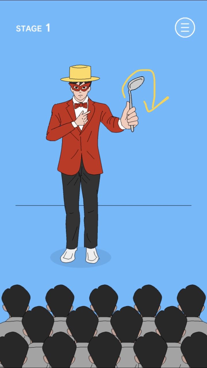 这个游戏很多时候需要滑动屏幕,所以会尽量以截图来展示。1.顺着黄色剪头方向滑动屏幕弯折勺子,直到勺子断掉*********2.顺着箭头方向把帽子脱下,有鸽子飞出来就成功了。**********3.顺着箭头方向滑动手上那根棍子(手指要在棍子上哦),会出来一束花,就成功啦**********4.不断地向右拖动主角嘴巴里的线(注意一定要保证拖动的时候手指在线上而不是画面其他地方),一直拖到