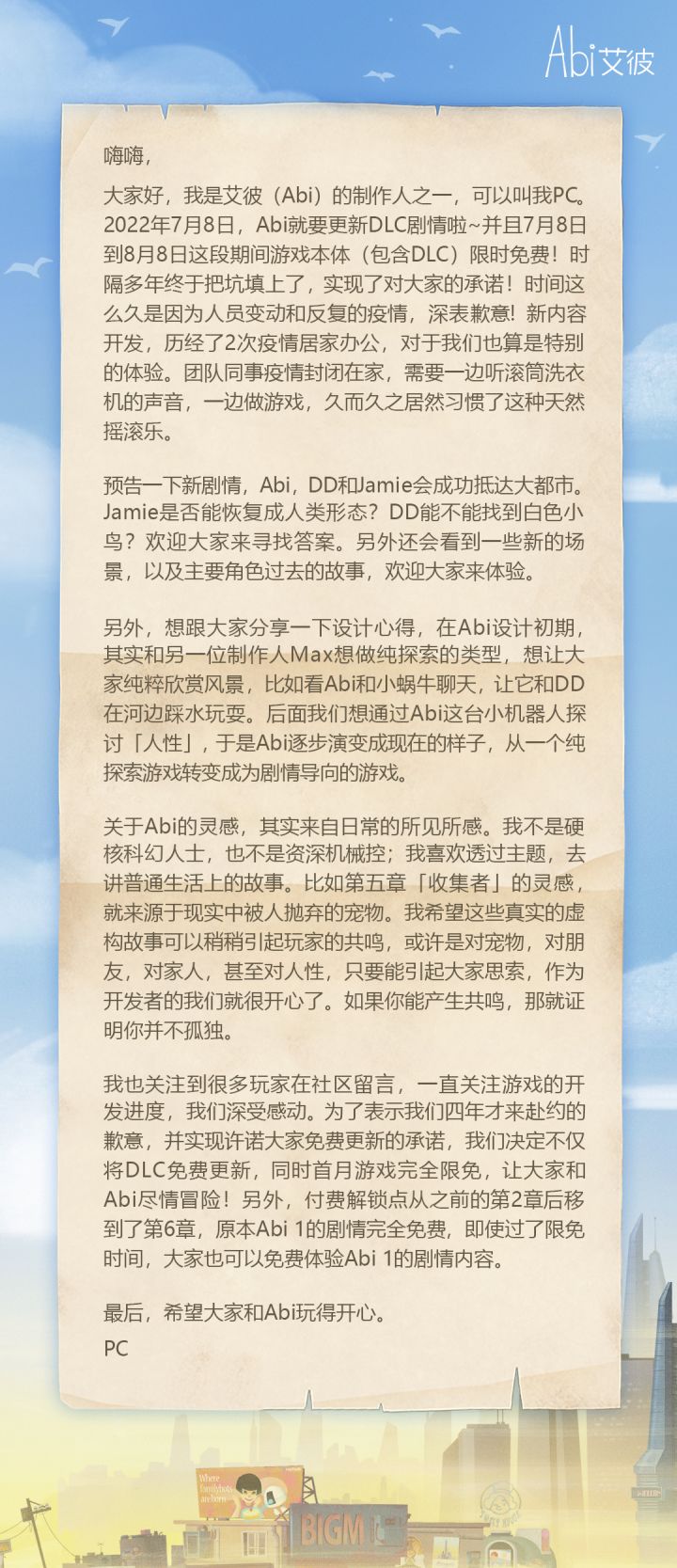 大家好,我是《艾彼(Abi)》制作人,一切都源自一场奇怪的梦,Abi入侵了我的梦境,轻轻敲醒了沉睡的我。 好久不见,说声抱歉。我回来了朋友们,带着Abi来兑现四年前免费更新的承诺。 7月8日-8月8日,《艾彼Abi》游戏(包含DLC)将会开启限时免费! 希望每个看完这个视频的你都能和Abi一起寻找自己梦中的远方。
