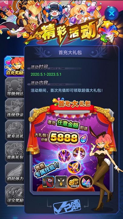 亲爱的冒险家们:期待已久的《天际冒险队》终于要和大家见面了!6月15日10点《天际冒险队》开启不删档内测,欢迎各位玩家的积极参与!为答谢玩家的厚爱与支持,特在游戏内推出了精彩的活动,活动期间,多重豪礼送不停,所有登录游戏的玩家都有机会获得丰厚奖励,下面我们来看看活动的具体详情:一、首充大礼包活动时间:2020.5.1—2023.5.1活动期间,首次充值即可领取超值大礼包!二、升级送豪礼