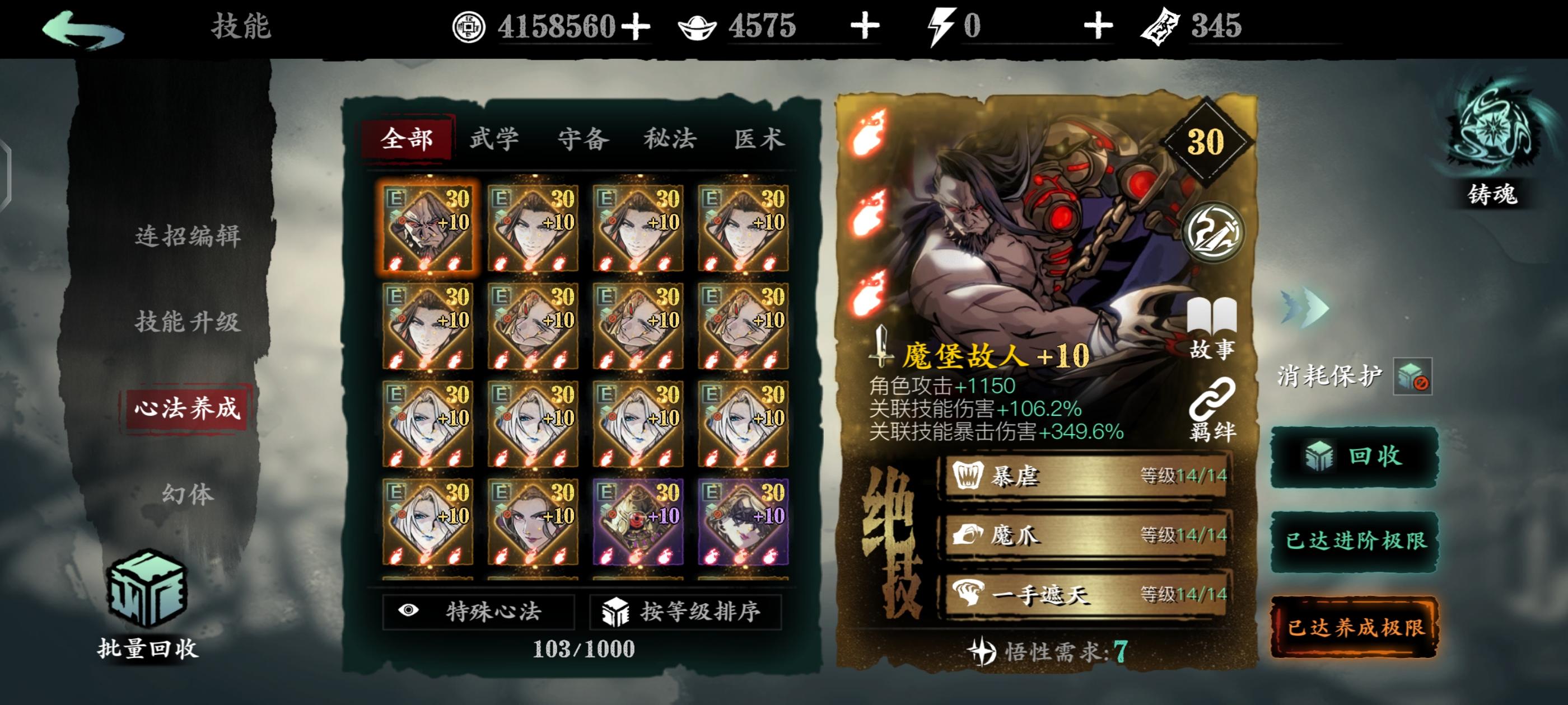 今天刚好60级,技能对应的心法如图,目前最完美的羁绊:魔堡3+脉冲3+CD2+结界2 (脉冲有人说很废其实是大错特错了,脉冲是刷罪体的神技,罪体容错率最高的羁绊),欢迎理性讨论(发现精华都在评论区,大家的观点碰撞简直太棒了!欢迎多留言和玩法有关的内容,让我也学习一下(´-ω-`))