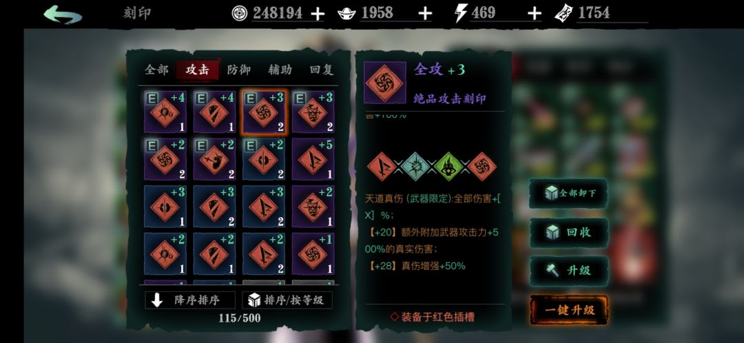 吞金刻印兽有多恐怖? 700万刷不出来五圣祝福。 首先每一件装备都有自己的独属的刻印组合。 弄清自己需要的刻印组合是第一步。 这里有我推荐的每个装备位置的刻印组合。 首先是武器。 是非洲人不配得到的天道真伤。 但我看目前榜单前列大佬都用的火神之怒,也许这个刻印组合也会给我们不错的伤害加成。 手套。 衣服是非酋哭出血泪的五圣祝福。 鞋子是能提高我们三分之一伤害的灵燕飞舞。(重要) 裤子我推荐杀气护体
