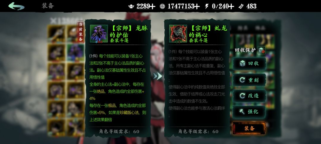 现在基本上开始养心法了,虽然咱们新号目前还是单龙伤害高一些,但是咱们可以做双龙斗篷了。 先给大家说一下“单龙斗篷”跟“双龙斗篷”的区别。 “单龙斗篷”(虬(qiu(二声))龙的祸心) 穿戴后可以在主心法上摆放一张副心法卡(不得超过主心法卡品质),在副心法上的卡依旧可以激活基础数值类绝技以及羁绊,但是一样的卡只能带一张(无论位置)。具体可以看装备描述。 “双龙斗篷”(龙脉的庇护) 穿戴后可以在主