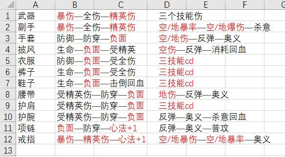 这份表格 前面代表前缀 后面代表后缀 前后缀词条可以同时拥有(每种最多三条) 所以只列出了三条比较重要的 重点:前后缀各只有三条的限制所以不会出现所谓的戒指暴击+暴伤+精英+心法(四条都是前缀,只能四选三)这也是这份表的意义 Tip:急着升宗师的 可以自行选择 有关生命和回血的吃的也比较多 普攻伤害和吸附距离都在后缀(除了武器和副手) 负面词条满100就不需要了(60级13% 50级10%)