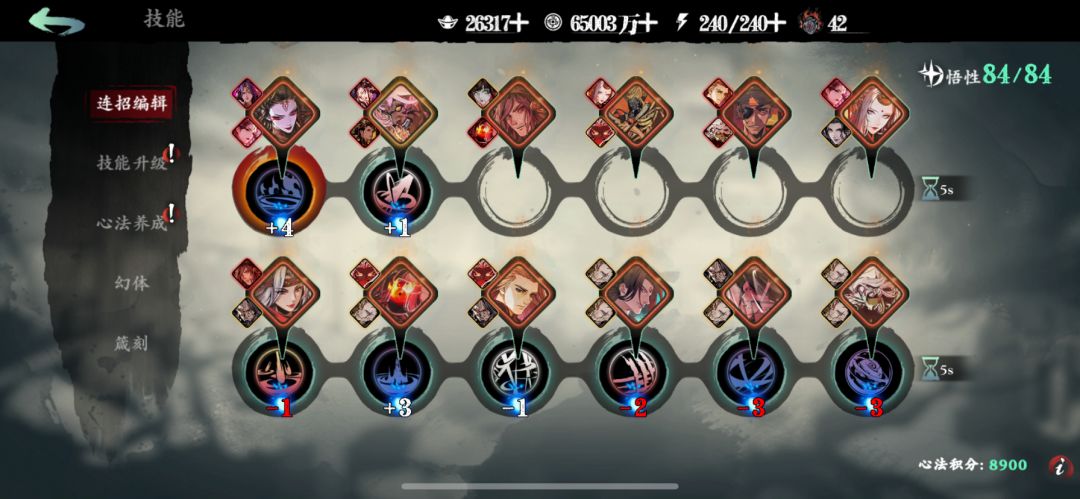 第五天没有什么可以提升的了,主要是完成任务(鸽子箱)还有推图,尽可能的推完所有的图以及完成第四天里的那几个主要任务。 目前是乱流版本,最强的套装就是他,后续有更强的;你们可以换更强的套装,例如窥天赛季出的铜币套,就是跟满配乱流相媲美的套装,没有刷出好词条强化满的乱流都可以直接换窥天赛季的铜币套。 讲一下铭刻怎么升级,放哪些卡好 铭刻里面可以放8张卡片,咱们新号心法没有那么厉害,就按照我的放卡片就行