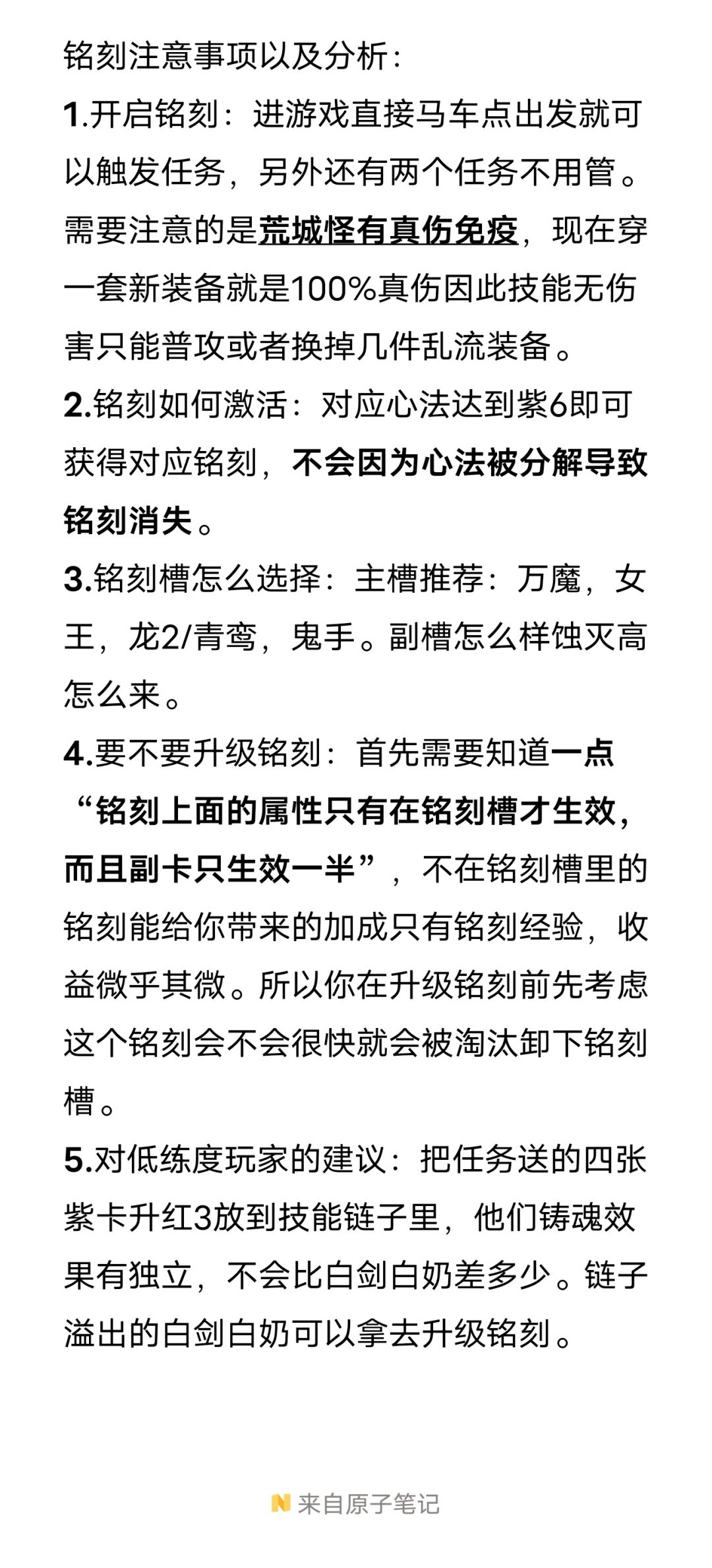 新手群:1059044391 不要傻乎乎在大厅一直等着问有没有人带团。 蹭团/提问首选新手群,随时都有人回复。 游戏内的聊天系统没有时间戳,而且打字动不动就违规发不出来,所以没几个人看。 一、蚀灭/心法获取 蚀灭是游戏目前唯一不会被稀释的增伤,下面说说如何获取蚀灭。 1.升级铭刻图鉴等级(1级=1点蚀灭) 首先在【江湖异闻】找到【乱心铭刻】任务完成后开启铭刻功能。 铭刻图鉴里的心法升级到紫6会激活