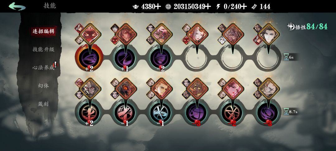 本次更新 优化了 技能流畅度、主心法位置 214蚀灭 第1套 是常规打桩链子 35~38 兆 左右 第2套 是血屠打桩链子 36~41.5 兆 左右 武器杀改 最佳 忧愁暗恨/银屏破 其次是裂帛 练度见后图 无九天 有几张没到紫6 没开红 龙5 诛心 红铁蛋 断弦