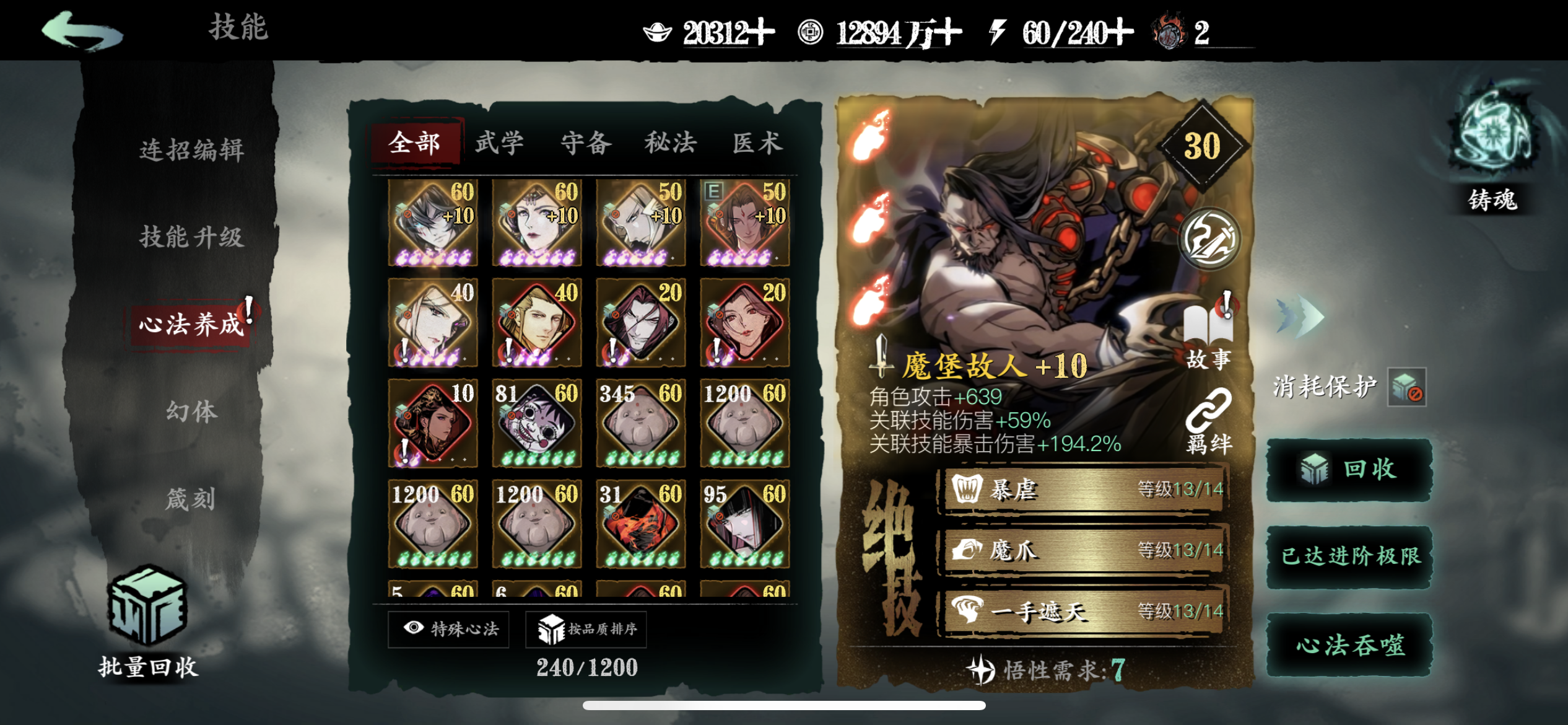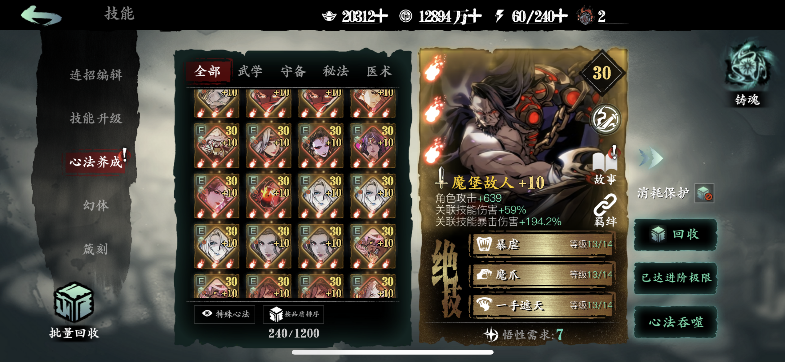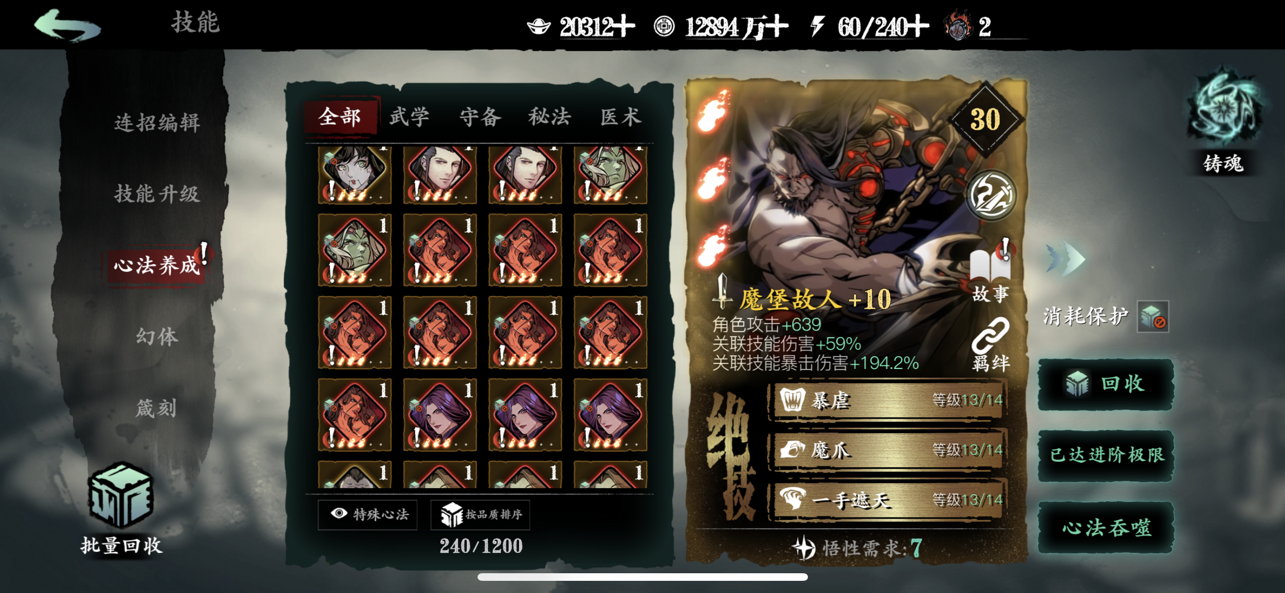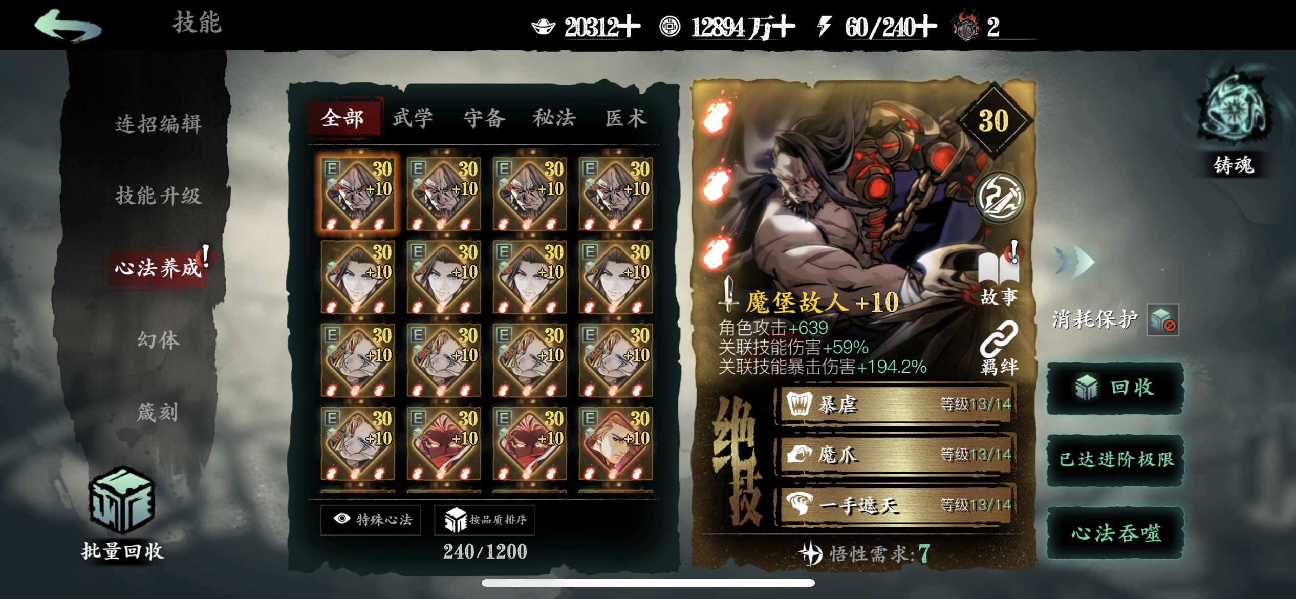 一、心法获取蚀灭是游戏目前唯一不会被稀释的增伤,下面说说如何提升蚀灭等级。1.升级铭刻图鉴等级把红卡和5张稀有橙卡升级到紫6开启铭刻图鉴,提升图鉴等级获得蚀灭。剩下4张普通橙卡和6张紫卡完成【入局试炼】会送的,这10个图鉴相当于白送了。之后消耗一张满级同名心法,可以让该心法的图鉴等级升1级,不推荐资源少的新手这么干。另一种方法是通过某些活动获取50个碎念升1级。2.部分心法铸魂满级把
