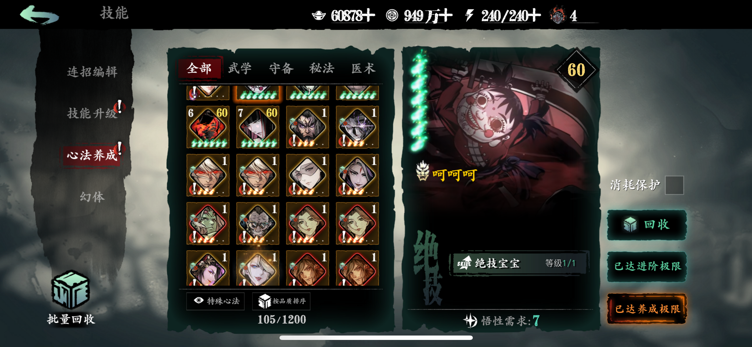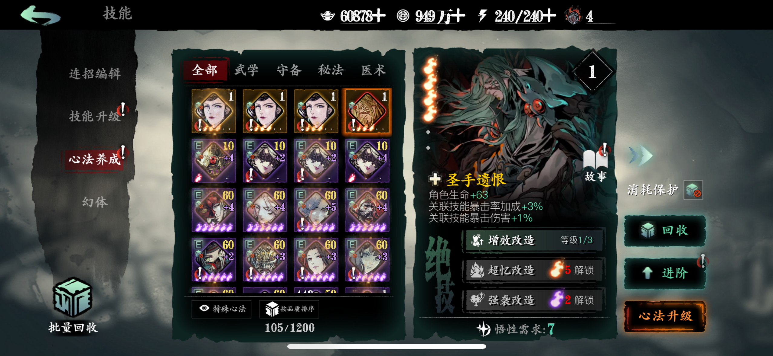 一、心法获取蚀灭是游戏目前唯一不会被稀释的增伤,下面说说如何提升蚀灭等级。1.升级铭刻图鉴等级把红卡和5张稀有橙卡升级到紫6开启铭刻图鉴,提升图鉴等级获得蚀灭。剩下4张普通橙卡和6张紫卡完成【入局试炼】会送的,这10个图鉴相当于白送了。之后消耗一张满级同名心法,可以让该心法的图鉴等级升1级,不推荐资源少的新手这么干。另一种方法是通过某些活动获取50个碎念升1级。2.部分心法铸魂满级把