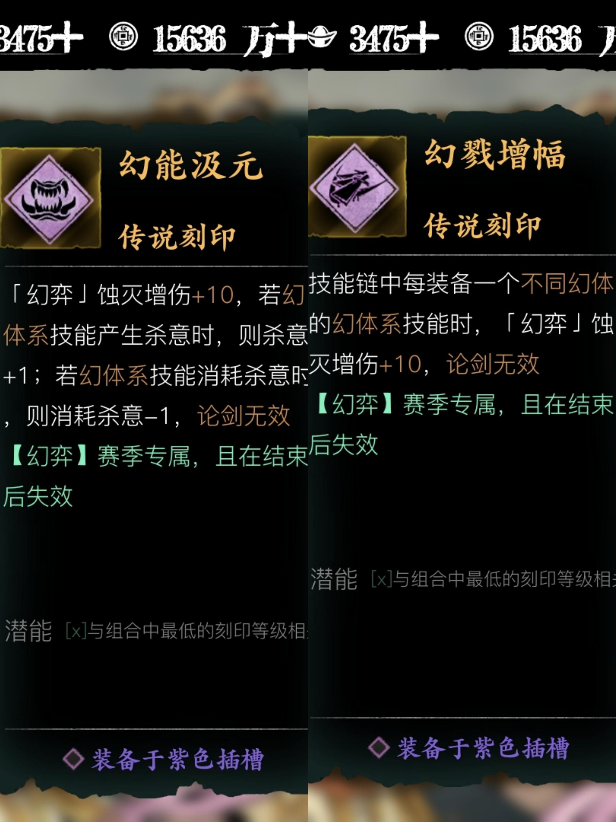 昨天出了个幻戮刻印,换上之后提升了20蚀灭,打个桩结果伤害只从21700到23525。我就奇了怪了,以为是幻戮这个刻印的问题。结果今天把峨眉刺升三级,带上试了试,没用幻戮的时候两个伤害差不多,乱心剑甚至高一点,用了幻戮之后带峨眉刺伤害直接26000还多。我又试了一下泰山压顶和震魂斩,用幻能的时候带两个技能伤害都是19000出头,比乱心剑21700低不少,换上幻戮后(用泰山压顶的时候也凑了三种幻体