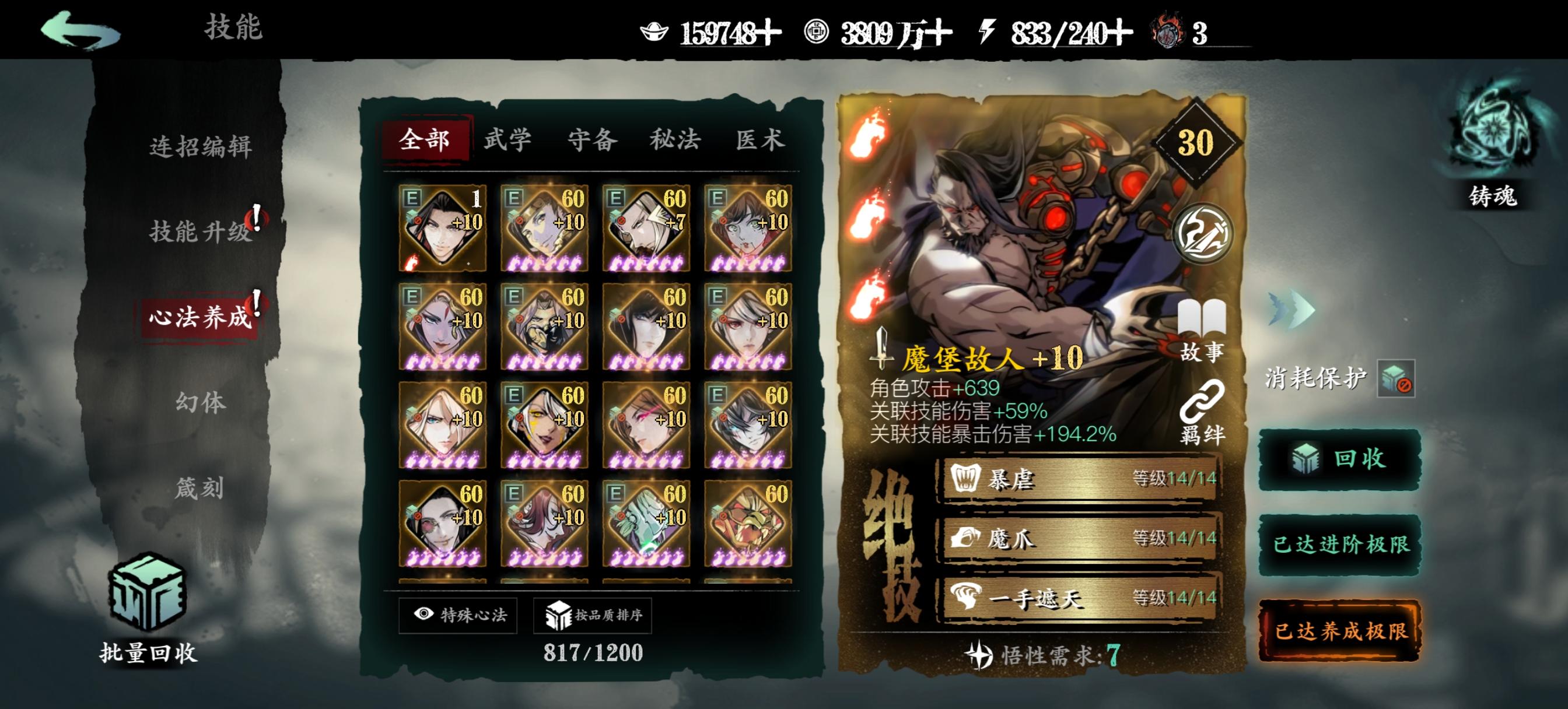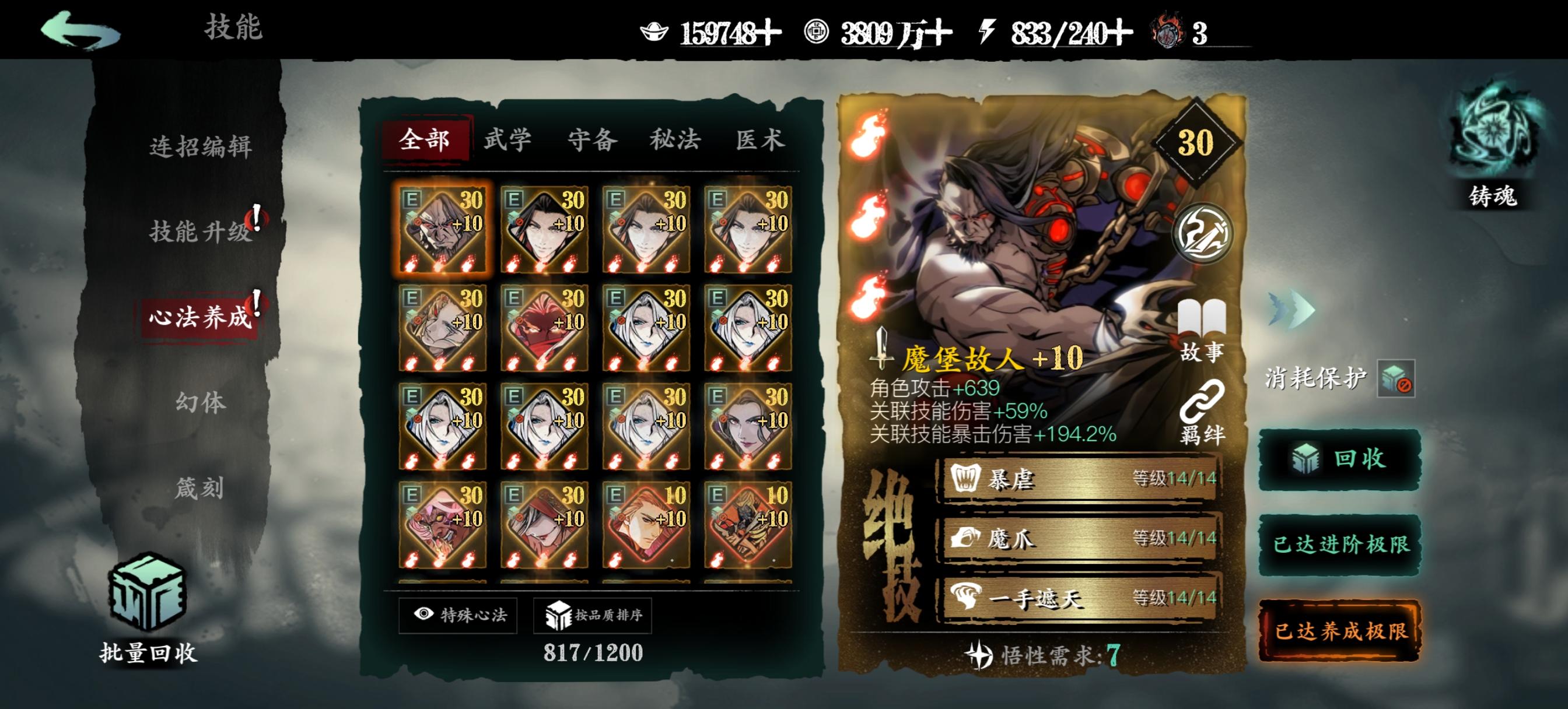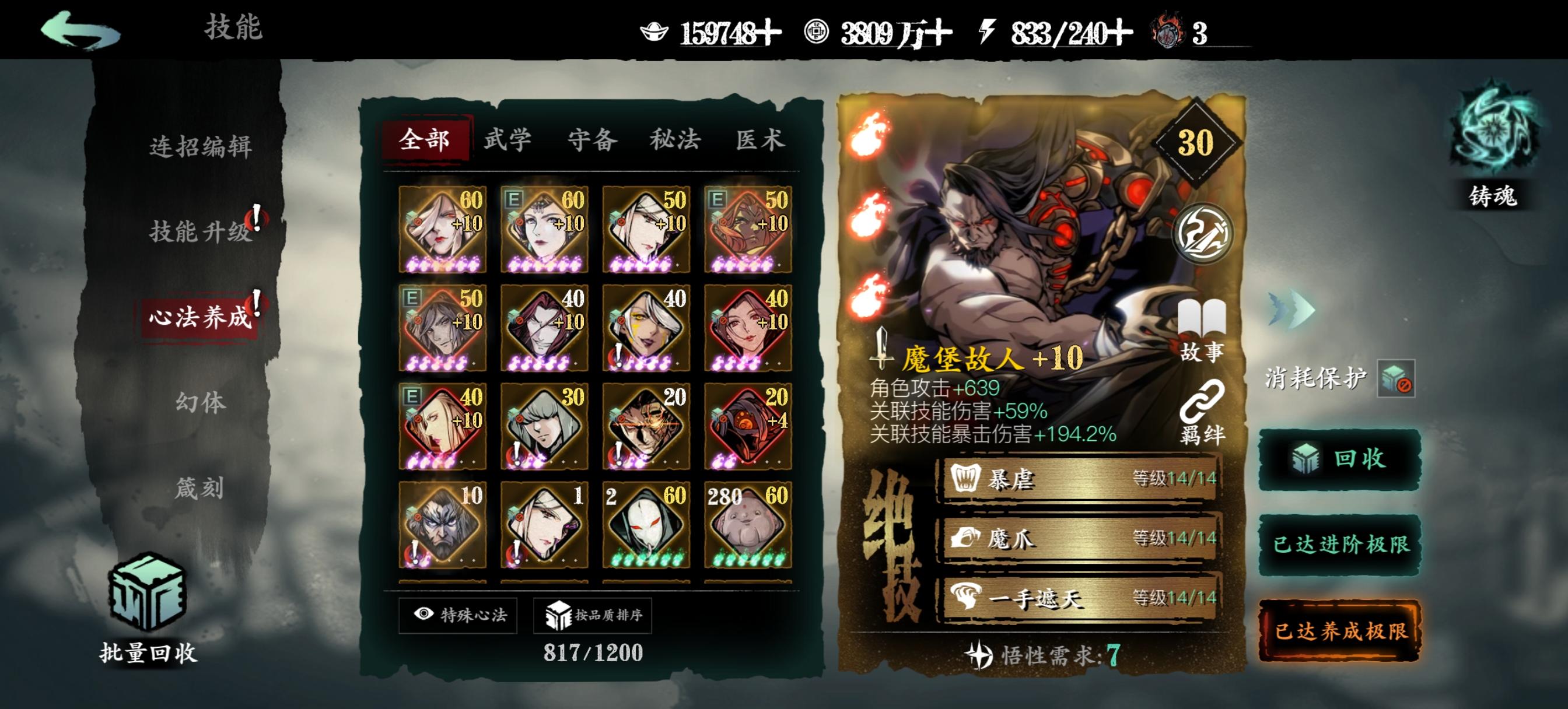 一、心法获取蚀灭是游戏目前唯一不会被稀释的增伤,下面说说如何提升蚀灭等级。1.升级铭刻图鉴等级把红卡和5张稀有橙卡升级到紫6开启铭刻图鉴,提升图鉴等级获得蚀灭。剩下4张普通橙卡和6张紫卡完成【入局试炼】会送的,这10个图鉴相当于白送了。之后消耗一张满级同名心法,可以让该心法的图鉴等级升1级,不推荐资源少的新手这么干。另一种方法是通过某些活动获取50个碎念升1级。2.部分心法铸魂满级把