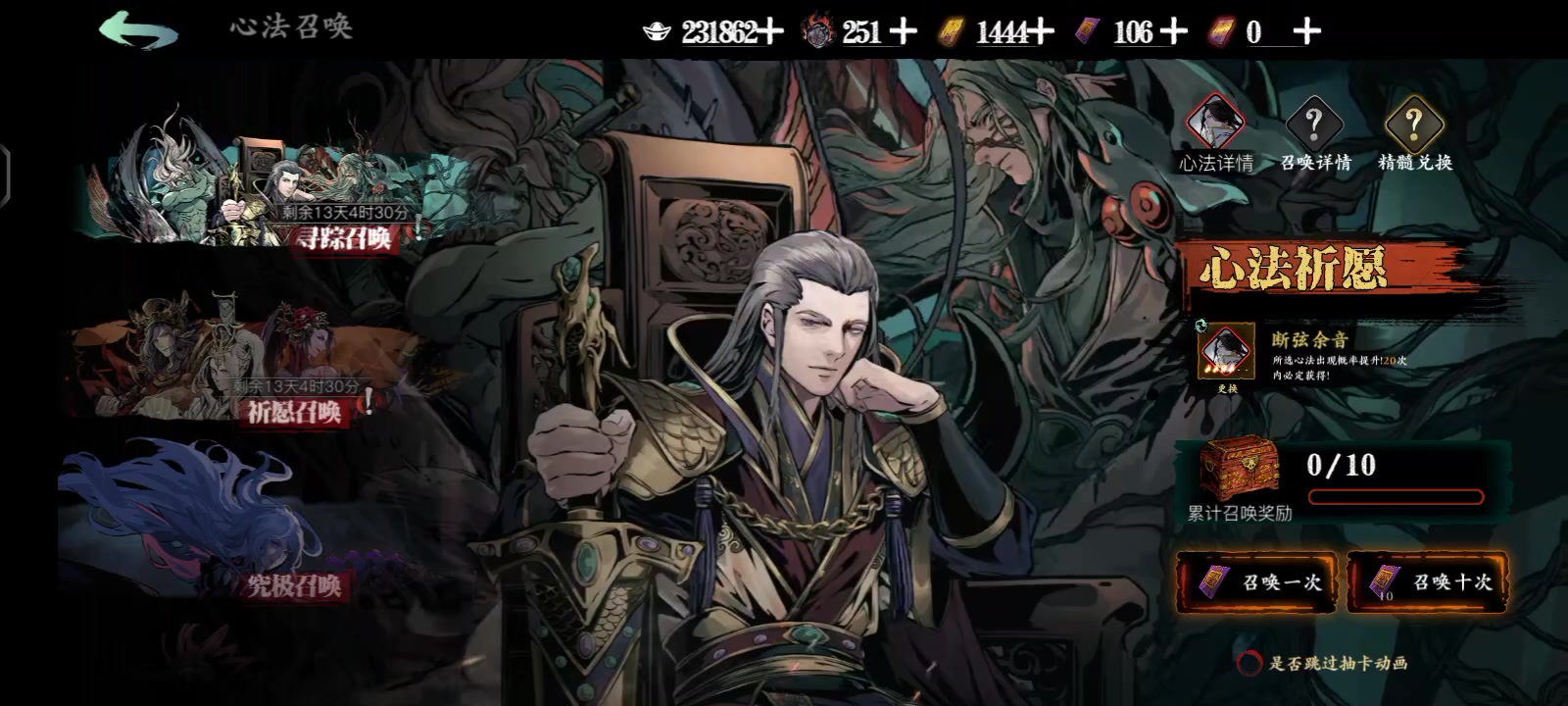 这个游戏想要伤害高,心法是核心,所以这篇是来讲解心法怎样养成的。首先这个游戏分为五种心法“武学、守备、秘法、医术、特殊心法”目前的话主要是围绕武学心法来提升的。(“““精简”””)推荐咱们抽取以下卡片红卡:“天穹飞翎1 “玉树龙兴”2,“道碎诛心”2, +其他红卡(其中萌新不打算充很多钱的优先囤卡抽天穹飞翎,其他红卡紫二即可)橙卡:“狂龙有悔”1,“魔堡故人”2,“黑暗无情”2,“万魔之魂