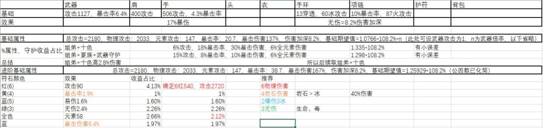 初始暴击率20%(满级项链+暴击武器) 初始暴击伤害120% 基础伤害按倍率1.000算约等于2000 黄色符石暴击率1.3%,伤害提升小于0.25% 蓝色爆伤符石5%,伤害提升小于1% 蓝色易伤,伤害提升约等于1.2% 元素符石30伤害,伤害提升约等于1.5%(被免疫和克制翻倍情况抵消) 红色符石,攻击不解释 绿色符石,生命或元素 有夏族四象的情况,符石不需要再穿透 穿透不加伤害,如果确实加了,