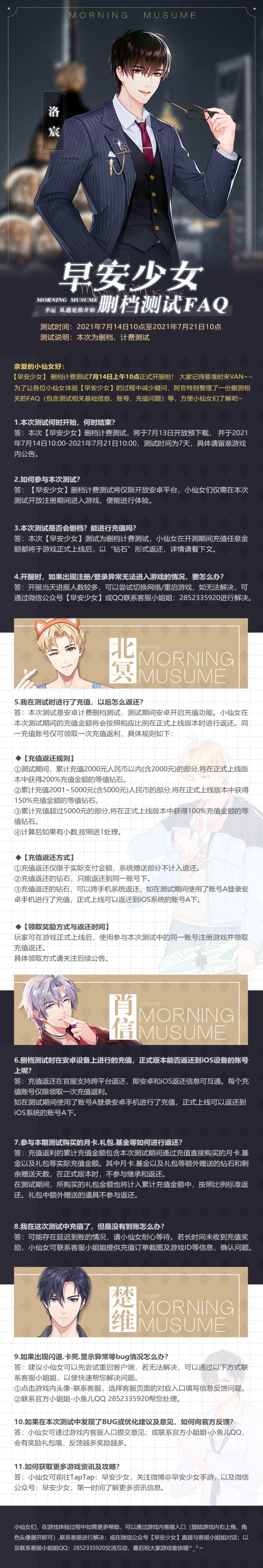 酱酱酱 亲爱的小仙女好:【早安少女】 删档计费测试7月14日上午10点正式开服啦!!!大家记得要准时来van~~~测试时间:2021年7月14日10:00 至2021年7月21日10:00测试说明:本次为删档、计费测试为了让各位小仙女体验【早安少女】的过程中减少疑问,阿官特别整理了一份删测相关的FAQ(包含测试相关基础信息、账号、充值问题)等,方便小仙女们了解哟~温馨提示:文末有惊喜福