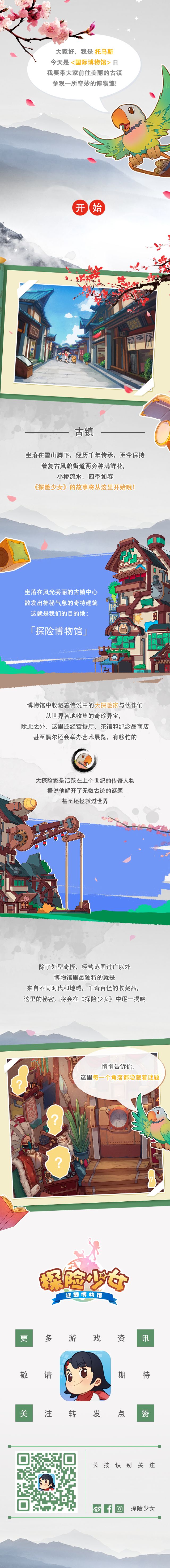 5月18日是 国际博物馆 日,我们选择从这个有意义的日子开始,定期发布关于本作的各种开发信息,往后也请大家多多关注预约评分支持哦。《探险少女》是一款适合所有人的解谜探索类功能游戏,采用一次性买断+DLC的形式发售,预计在年内推出试玩版。首先为大家展示的,是女主角安和伙伴们生活的古镇,还有本次故事的重点场景:谜题博物馆。
