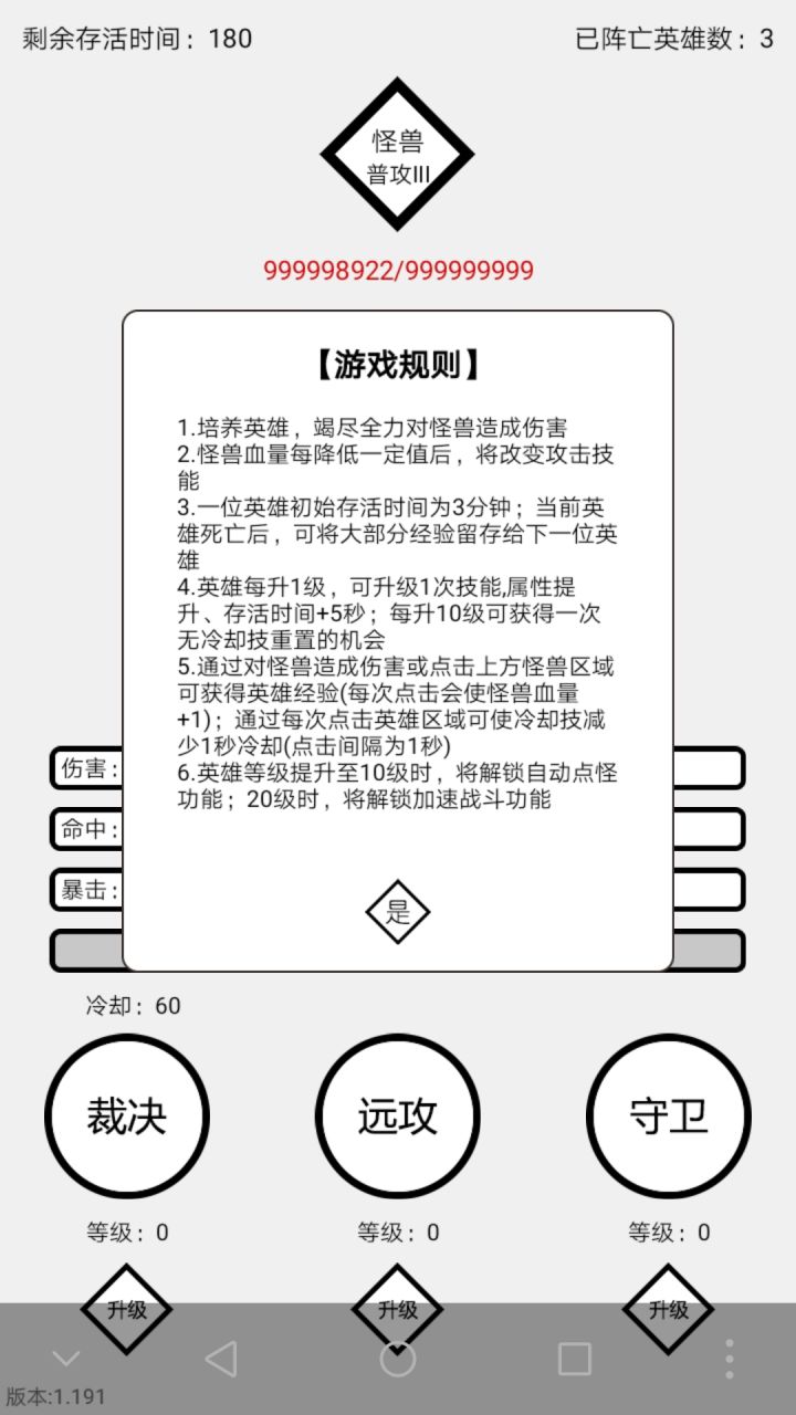刚进游戏一脸懵,点哪都没用,点怪兽那个菱形也不加经验,点英雄也不减冷却时间?然后我以为第一条命就要干看着?结果被怪兽打死了?而且我发现攻略里的游戏规则里面都告诉点怪兽加经验什么的,我的规则里没告诉我?什么情况,玩不懂啊