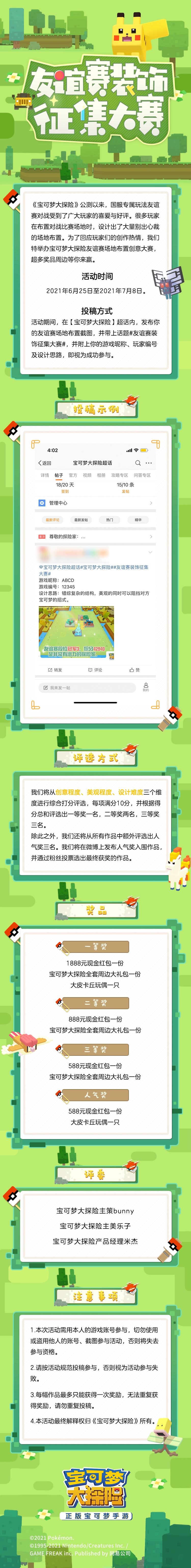 参与不足,取消开奖 时间一点点的过去,我们和宝可梦一起成长。记得第一次参与战斗吗?记得第一次吸引的宝可梦是哪个吗?记得最快推进章节的时间吗?记得哪个料理颜值最让你心动的吗?不知不觉中我们在《宝可梦大探险》中经历的这么多美好,留下了珍贵的回忆。 经过几次游戏补丁和商店的上新,《宝可梦大探险》已经早已不是原来的模样,变得越来越全面和完美了呢。 酷暑夏天,快来宝可梦一起参与活动吧~ 【活动时间】 202