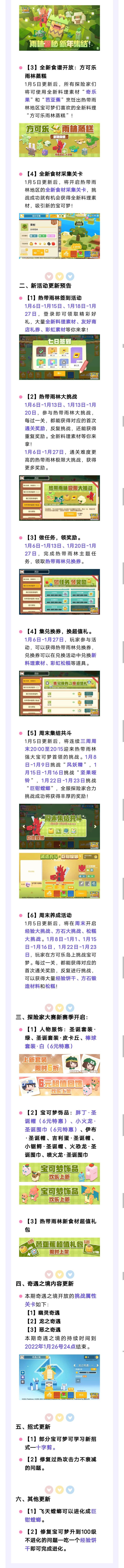 亲爱的探险家:我们计划于2022年1月5号进行不停服更新。以下是更新内容预览:一、方可乐·火山小岛热带雨林开放【1】 开启方可乐·火山小岛第三章节—热带雨林1月5日更新后,火山小岛的热带雨林地图将会开放给探险家!【2】新世代宝可梦方萌登场1月5日更新后,探险家们将有机会和新世代宝可梦巨钳螳螂、莲叶童子、热带龙、木棉球和种子铁球成为伙伴!【3】全新食谱开放:方可乐雨林蒸糕1月5日更新