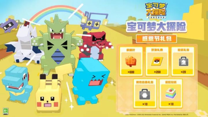 为了对各位探险家一直以来的陪伴与支持表示感谢,我们为大家送上了感恩节限时礼包:枫糖叶*600、好友礼券*200、松糕礼包*20、属性结晶礼包*10、彩虹松糕*10。(11月29日前上线可领取)在未来的日子里我们会为大家创造更多有趣的体验,希望各位探险家与宝可梦一同在方可乐岛上留下的珍贵回忆!与此同时,全新活动正式开启,特别食谱烹饪、周末集结共斗、还有个性服饰饰品……多重活动让人目不暇接。活动