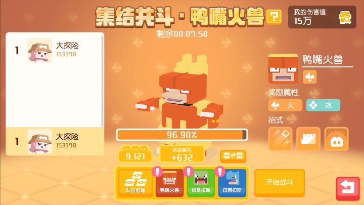 随着全新活动的正式开启,首场周末集结共斗来咯~首轮上阵的首领宝可梦是“鸭嘴火兽”,它的招式有“破坏光线”、“火焰拳”、“喷烟”,探险家们可以提前熟悉,来更好地应对挑战时的困境!本次活动还设置了惊喜奖励,快来了解集结共斗的资讯吧~活动日期:11月27日—11月28日活动时间:20:00—20:15活力满满的火属性首领宝可梦“鸭嘴火兽”已经准备好,迎接探险家们的挑战啦!探险家们可以在活动时间自行
