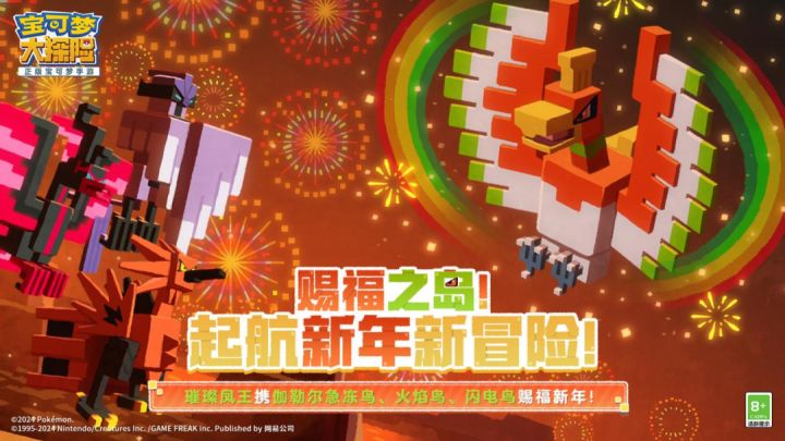 新春到,凤王至!先祝探险家们兔年走隆运,如意万事顺!由网易、The Pokémon Company、GAME FREAK inc.携手开发的《宝可梦大探险》即将开启春节庆典,本次我们将来到祈福之岛,踏上全新的冒险!传说中的宝可梦——凤王重磅登场,雷公、水君和炎帝这三位凤王的守护者也将迎来返场,太阳和月亮伊布惊喜登陆方可乐岛,还有新料理、新挑战、回归福利和创作征集活动等待探险家们前来解锁! 【