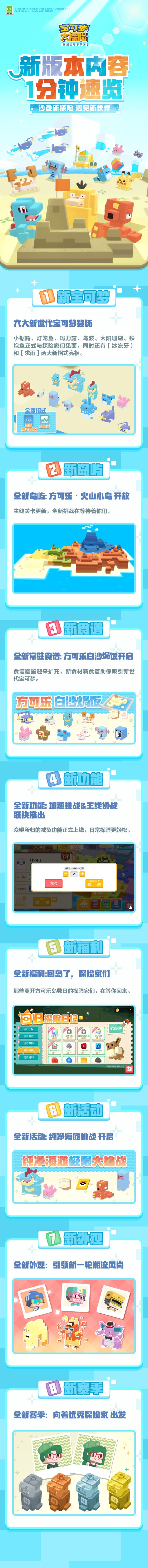 亲爱的探险家:我们计划于2023年8月17日进行不停服更新。以下是更新内容预告:一、新活动更新预告【1】活动料理开启8月17日-9月7日,活动料理“方可乐幽幽蛋糕”开启,玩家可在活动中获得活动食材影幽木。“方可乐幽幽蛋糕”可以吸引如下宝可梦:呆呆兽、六尾、催眠貘、喵喵、超音蝠、波波、卡蒂狗、尼多兰、尼多郎、大岩蛇、勾魂眼、鬼斯、多龙梅西亚、沙丘娃、花岩怪、骑拉帝纳!【2】特殊料理