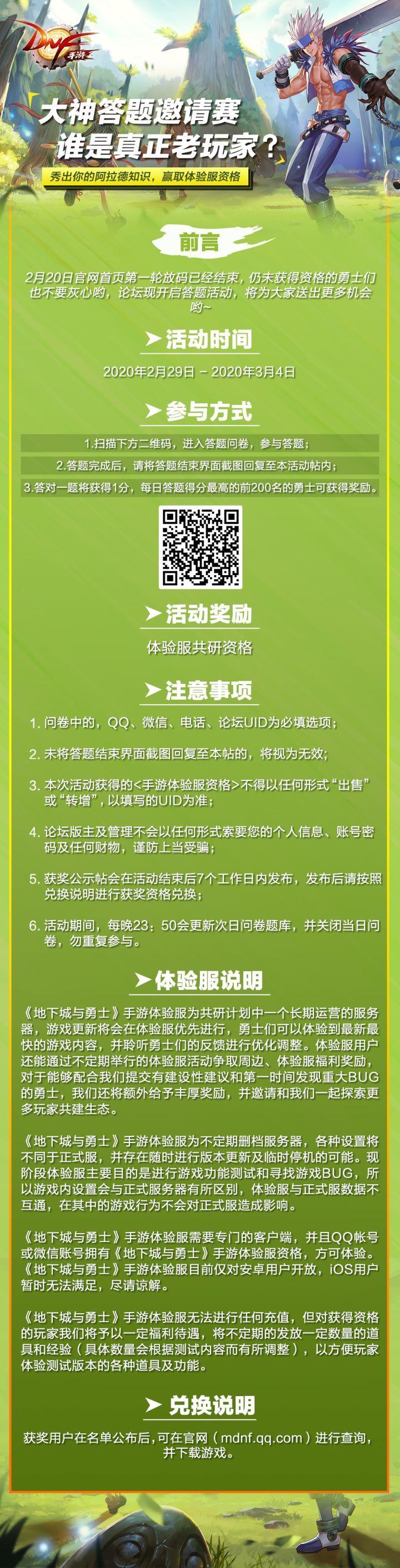 DNF手游在2月29日上午10点,已经在游戏官方论坛开启了新一轮论坛抢码活动!玩家可在2月29日~3月4日期间,通过官方举办的“大神答题邀请赛”赢取体验服资格,每日答题积分排名前200的玩家将获得体验服测试资格!注意!!!!!!!!!活动需要前往官网论坛参加,请大家完成答题后前往官网论坛参与活动,在本帖下方回复是无效的哦~官网论坛活动地址传送门→详情参见下图↓↓↓↓↓↓↓