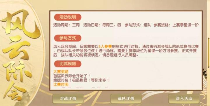 周末本是明月菌的快乐肥宅时光,但却被外面的敲锣打鼓声吵的脑壳疼(╯▔皿▔)╯!究竟是啥日子要弄这么大动静啊?菌正要开门出去质问,却被开门后眼前的一幕惊呆了!原来,是首届风云际会大赛要开始了!!!风云际会 一争高下风云际会是全渠道跨服的5v5玩法,少侠们要与队友默契配合,发挥出团队的力量来取得胜利。在紧张刺激的跨服战斗后,获胜的少侠们还会有专属的奖励哦!具体的比赛规则与时间明月菌已经整理好了,一