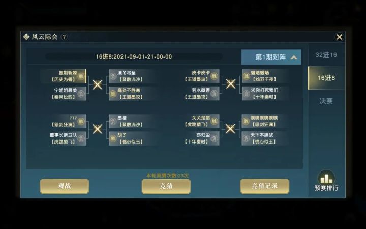 经过了数日紧张又刺激的风云际会比赛battle,我们终于迎来了万众瞩目的争夺冠亚军决赛!作为场外气氛组的明月菌,早已被队伍的情义和团魂点燃,现场开启“嗨起来”模式!“(。・∀・)ノ゙就在昨日,风云际会巅峰决赛已正式落下帷幕!在如火如荼的切磋氛围下,“神仙打架”场景频频出现,让人历历在目,同时,又为冠亚军的诞生起身喝彩!那么,就让金砖讲解员明月菌为少侠们回顾一下比赛情况吧~4进2 成功会师9月8