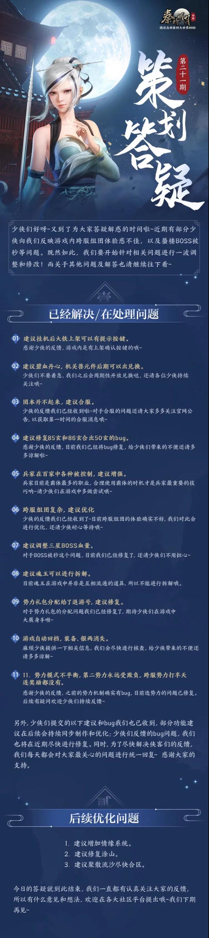 墨镜一戴,谁也不爱,表情要拽,走路要帅!路过的少侠看到明月菌这一打扮直呼:这是要弄啥咧?别问,问就是明月菌去帮少侠们反馈问题解答,得到了最新的策划答疑文件,都给我看好了(๑•□ㅂ•□)و✧策划答疑第二十一期在本期的策划答疑中,关于跨服组团的调整,以及蜃楼BOSS被秒等问题进行了优化,快来下滑查看更多详情内容吧~秦时首届视频大赛咚咚咚!各位少侠们,秦时首届视频大赛已上线!投稿秦时明月世界手游