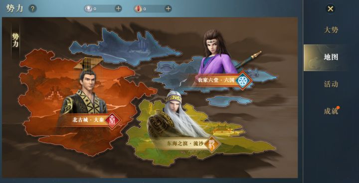 首先,每个势力有自己的地图,大家确保自己已经加入某一方势力(大秦,六国或流沙),就可以通过点击地图右下角的“势力”来看到势力地图的分布。