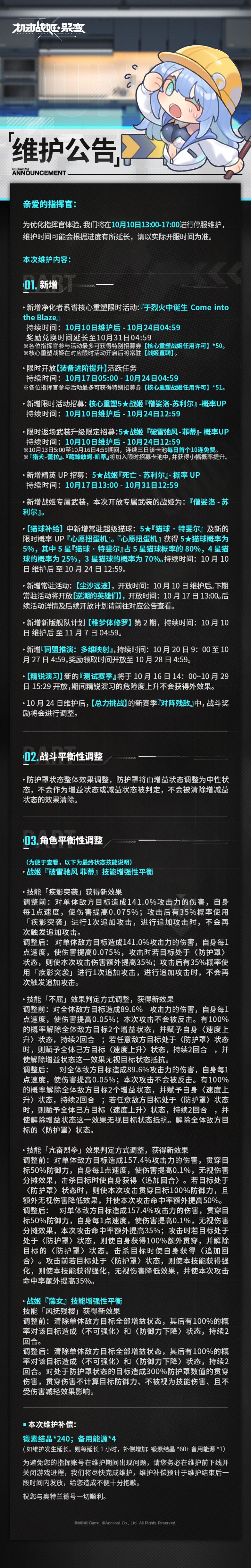 #机动战姬:聚变# #机动战姬#我们将在10月10日13:00-17:00对「奥特兰德号」进行维护整修,在此期间您将无法登陆舰体。整修完成后我们会为您提供相应补偿物资【锻素结晶*240+备用能源*4】维护时间能会根据进度有所延长,请以实际开服时间为准。具体整修内容及功能详细介绍已上传,静候您的查阅。愿您在接下来的战役中一切顺利。