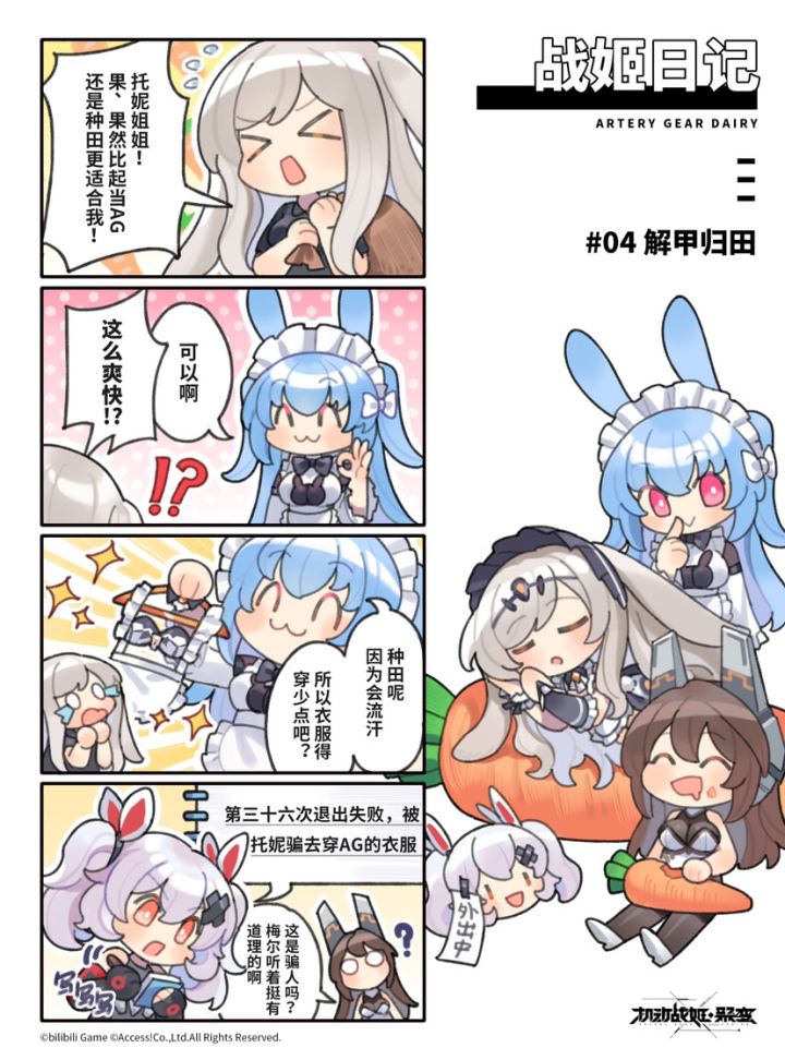 胡萝卜中队「奶油日记」活动已于今日结束。可琳姆留舰观察期间,胡萝卜中队队员对她照顾有加,使她与AG核心的适配度显著上升。 因此,团队记录下了她们的部分对话,或许能作为未来增强团队凝聚力的方案参考…… 《战姬日记#4:解甲归田》 ———————————— “这套衣服是托妮姐姐给我设计的……好像是叫,女仆服?” “本来还有更华丽的款式,不过,托妮姐姐还是喜欢我穿这一款呢……”