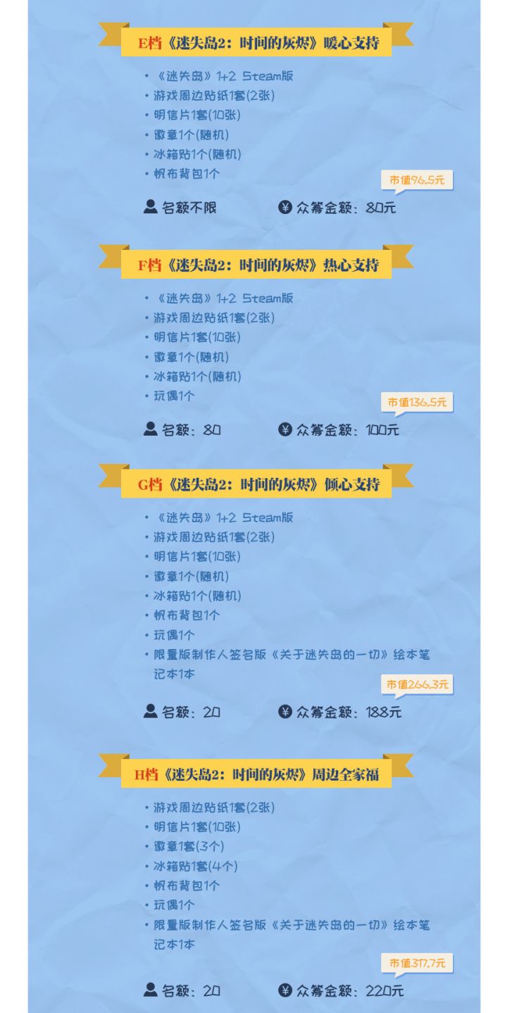 亲爱的岛民大大们:在大家的热情支持下,我们的众筹进度也已完成三分之二啦!o(*^▽^*)o~之前小迷妹收到了许多岛民大大的反馈,希望可以开通更多灵活的档位,满足大家不同的收集需求。为了答谢大家一直以来的支持以及反馈回应,我们决定新增四个回报档位!新增的其中三档为Steam版游戏的回报,还没有入手Steam版的小伙伴赶紧来瞧瞧;剩下一档为限量的周边全家福!包含全套《迷失岛2:时间的灰烬》精美周