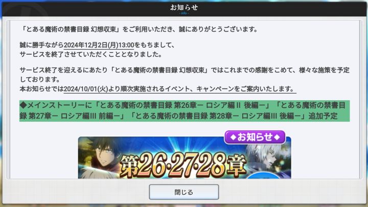 游戏于12月02日国内时间12点正式关服。陪伴了我五年五千六百多个小时的魔禁手游结束了,虽然还有个离线版本,但离线版阉割了所有语音,实在不尽人意。感谢这五年来的游玩时光,每一天登陆游戏已经是我五年来养成的习惯了,现在要离开真的很不舍。希望下一个魔禁手游能尽快来到吧#魔法禁书目录幻想收束 #又一款游戏关服了 #关服