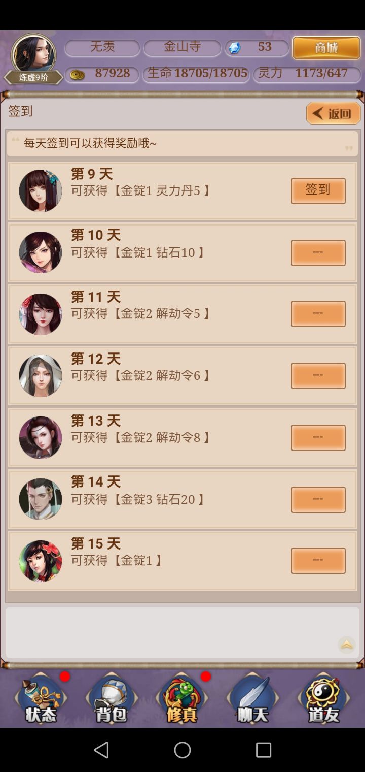 金币的主要来源就是签到、任务、挖宝和副本,但副本不是每天都能打一个新的。签到的话多的30w少的只有10w很明显,一半的奖励都是10w的而这个游戏用金币的地方有很多——每天副本扫荡要26w一大堆的灵鬼没接收。一个灵鬼空间1.5w,二星的要15个,三星的要45个,四星要142个 还有无数鸡肋任务要放弃替换 灵鬼渡劫? 主线任务要灵芝?(当时卡了我好久) 炼丹? 打坐5000千一小时?没