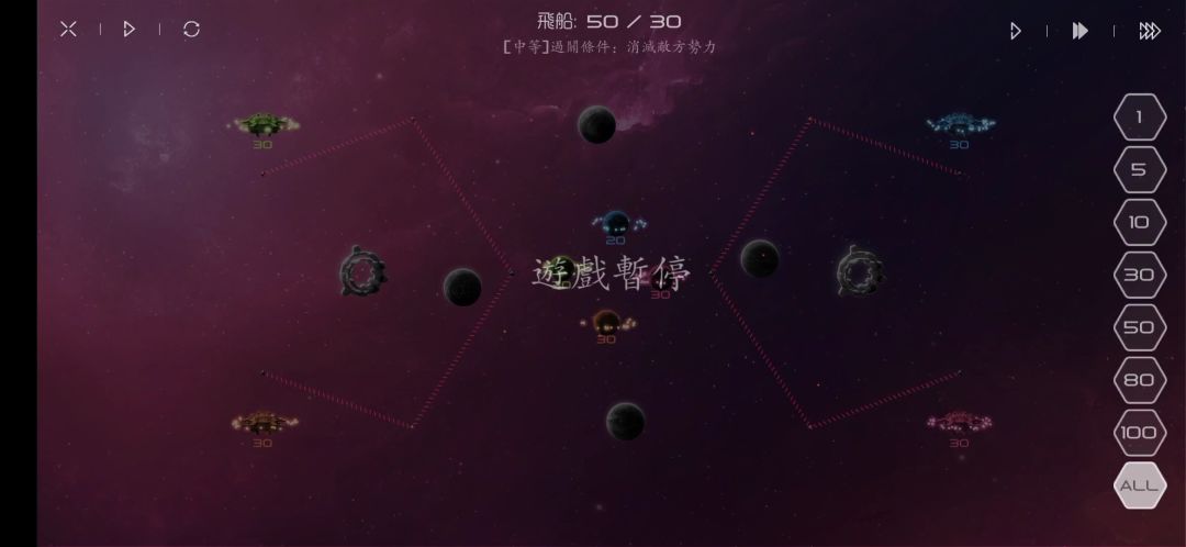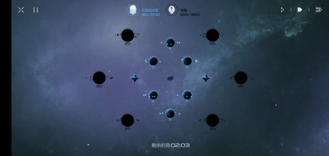 上来先暂停把速度调成一 然后左下的五飞船守一个炮塔,左上五飞船守一炮塔 其他飞船全守脉冲炮,然后守过两波敌人,就可以改成二速,然后重新把行星给占回来就可以过了