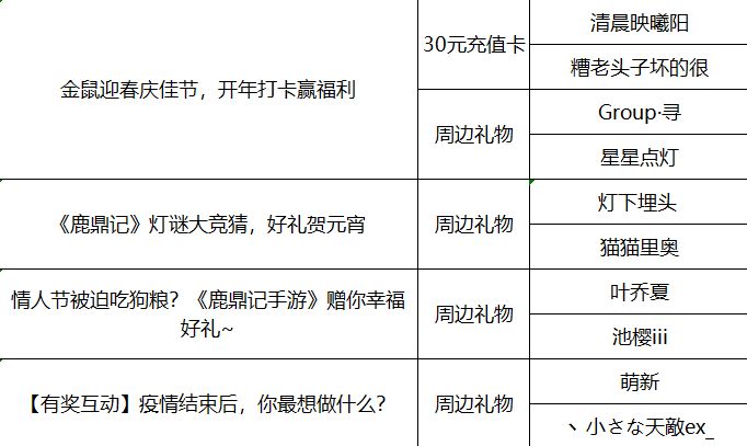 各位少侠,由于年后的这场疫情,全国各地都受到了巨大的影响,我们也不例外,本来准备年后跟大家正式见面的,但是现在工作受限,许多小伙伴都无法进入正常的工作节奏,所以在这里只能再一次跟大家道歉,砰砰砰!!! 今天多隆在这里发布一下近期活动的获奖名单,请各位中奖的少侠添加发奖小弟QQ:1548066187,记得备注TapTap的昵称哟,否则发奖小弟不会通过的,请各位在开奖之后的半个月内及时领取,过期不候哟
