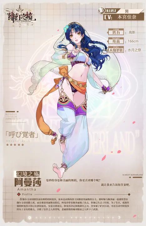 《绯红之境》将于3月11日推出全新SR人物。 幻境之殇——阿曼莎 画师:关 CV:本宫佳奈 “曼妙的身姿和美丽的舞蹈,你更喜欢哪个呢? 不过无论选哪一种,接下来的表演都会让你沉沦。” 手腕脚腕上铃声脆响 薄纱笼罩 窈窕的身姿 柔媚的舞蹈 少女显得成熟而性感 酒馆里缭绕的烟雾 又为少女增添一份神秘气息 来往的酒客 不止一次猜测少女的来历 少女白皙脖颈上 华美的金色项链 也许是过去身份的象征 “可能是