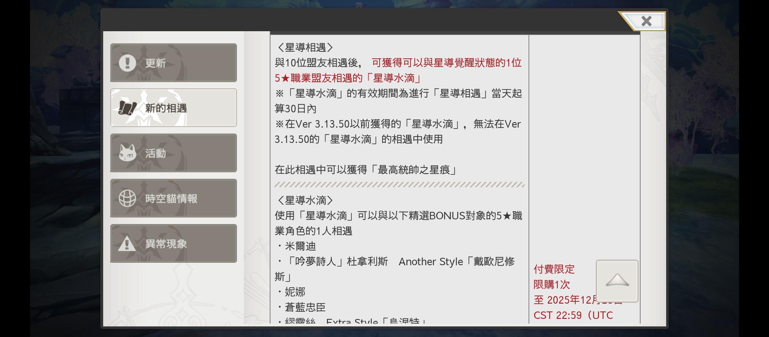 又可以氪金下池捞一捞乌兹赫拉和伊津奈了,不过这次这两位貌似不在同一个池子里,而且这两个所在的付费池没有当期UP概率%10,所以想抽出来还是得看运气,另外付费池子送的最高统帅星痕就是白送你一个星导觉醒的角色,不是自选还是得看运气,如果那上面的都有那想抽出一个new,是非常难的,另外免费池也有新出的薇尔丹塔,这次的当期up%10付费池有as赛丝塔以及电锯,